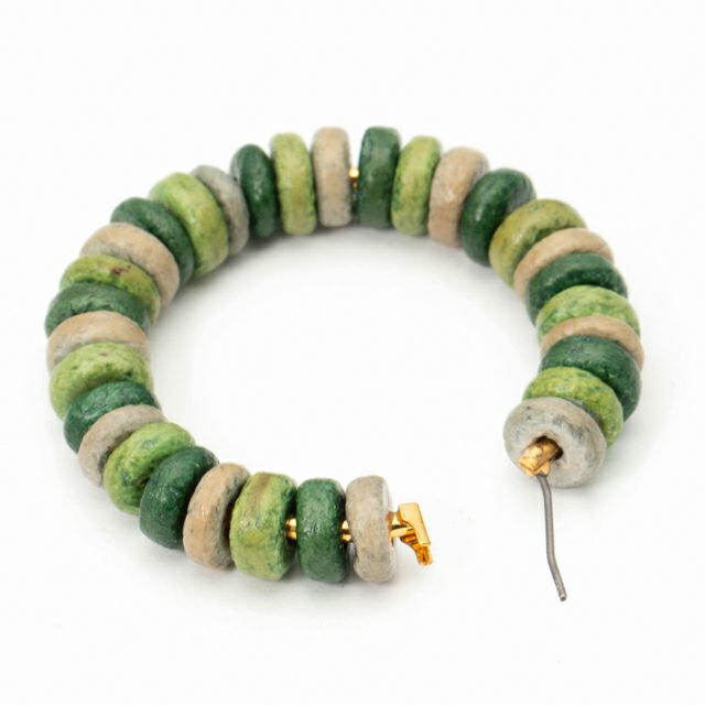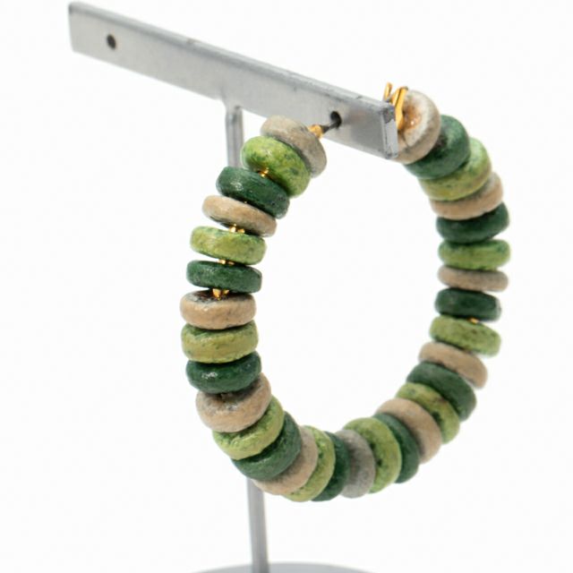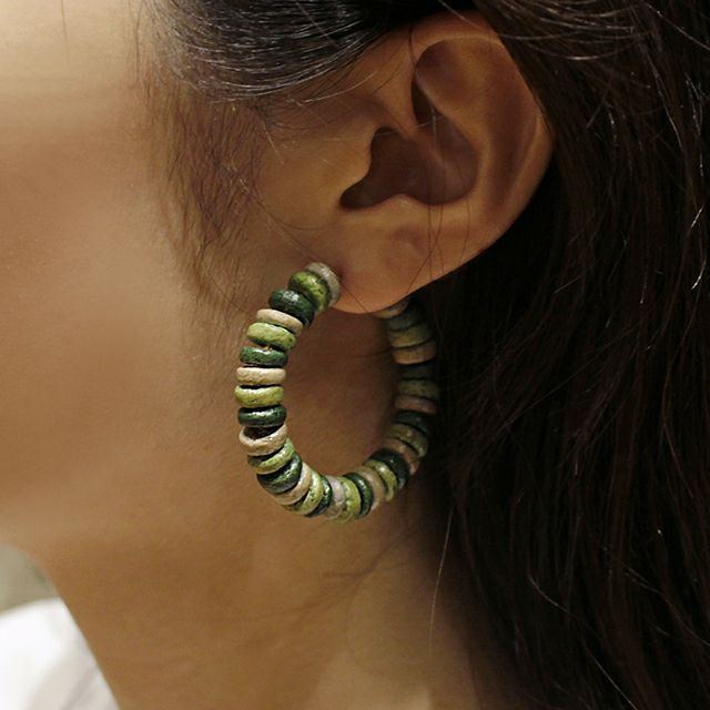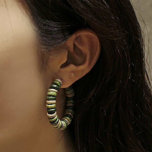 配色になった3色のビーズが印象的で、定番のフープピアスを新鮮なムードに。