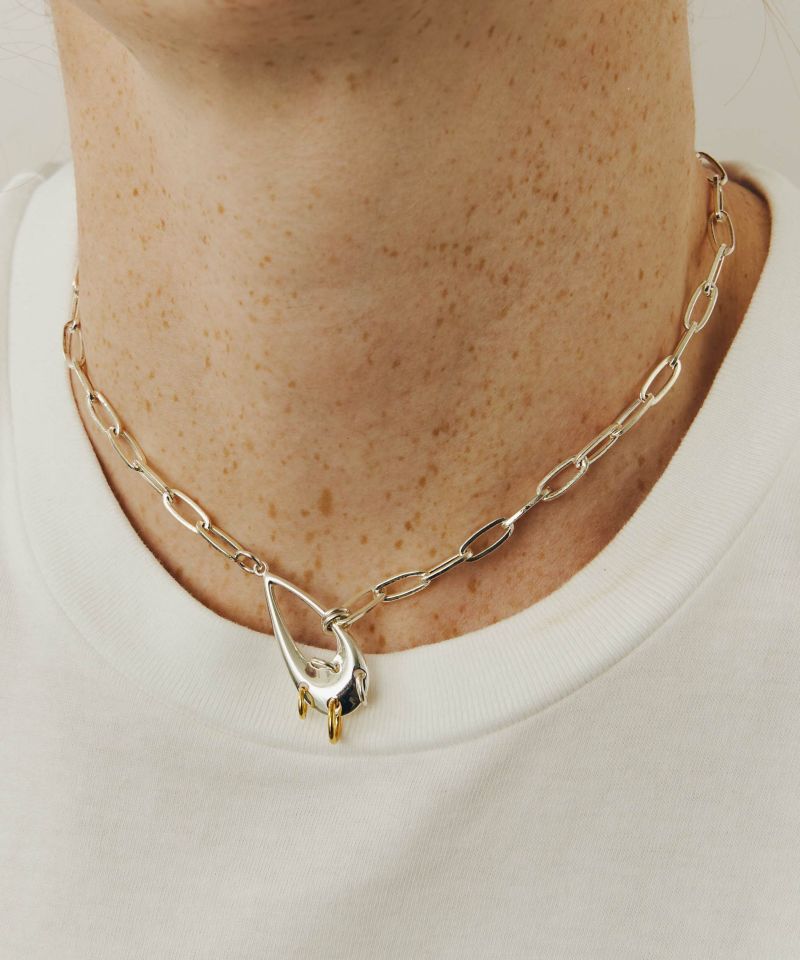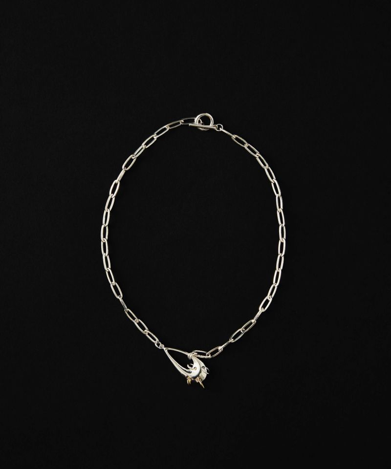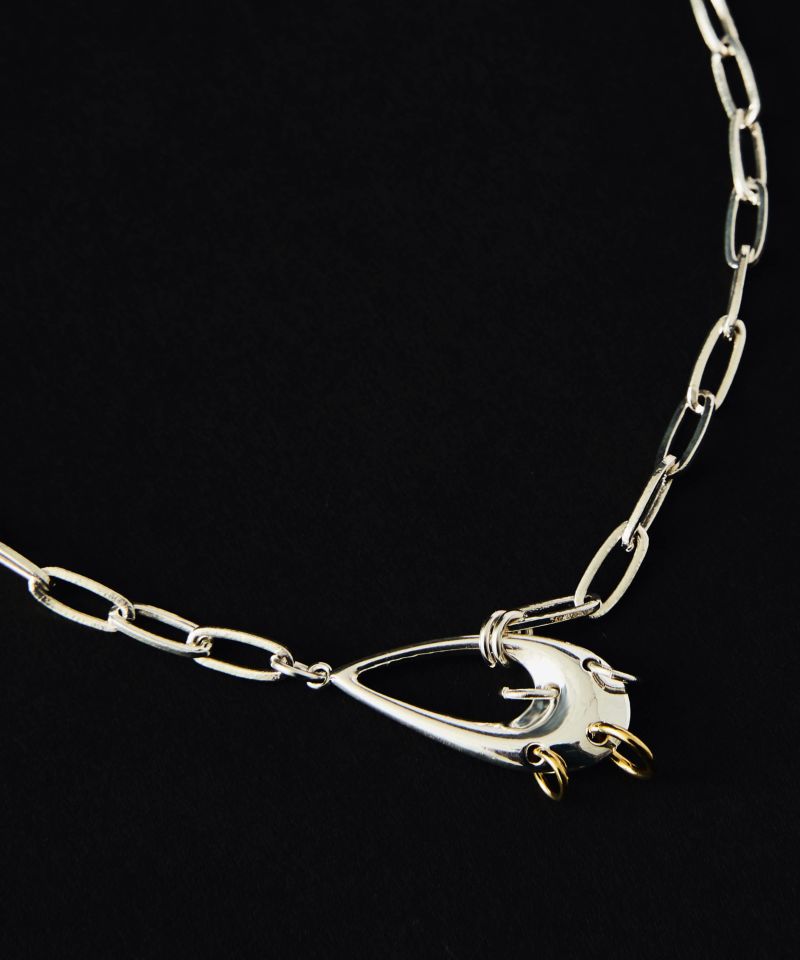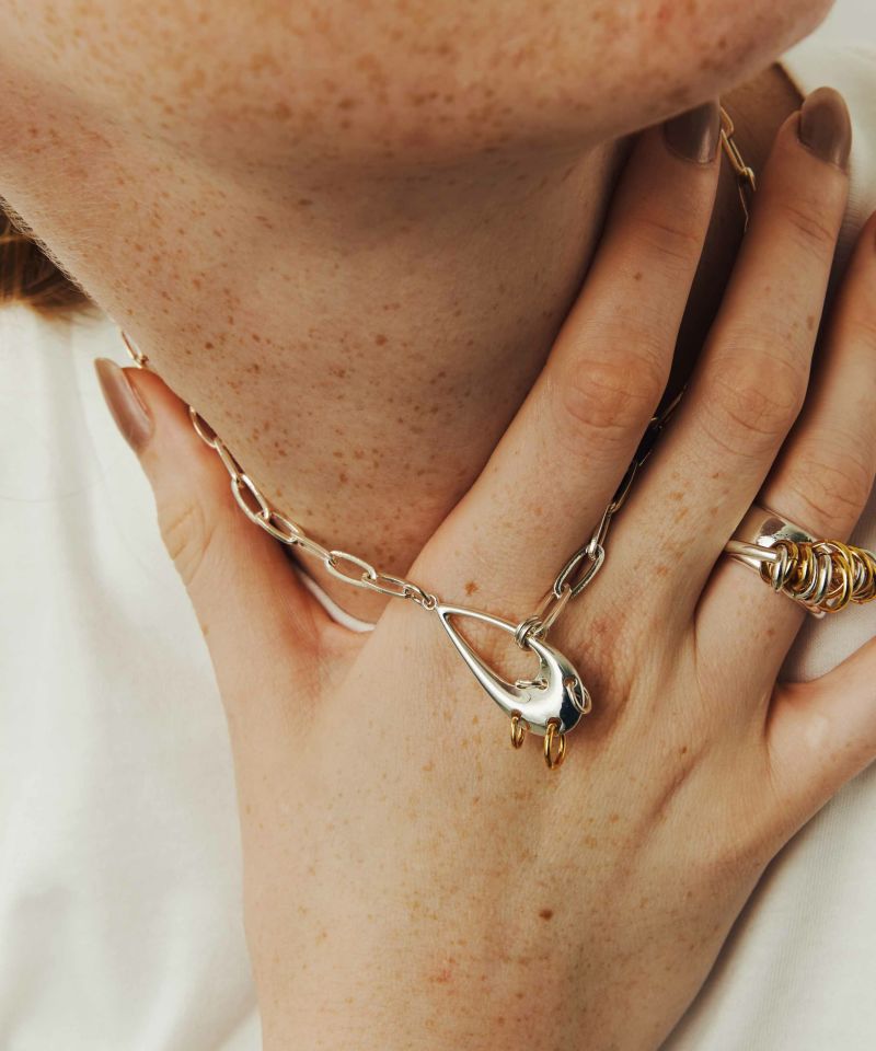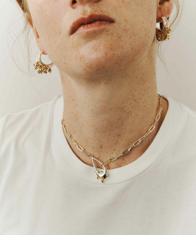大小のCoilリングパーツを散らばせた新しいシリーズ。 程よいボリューム感のチェーンを使い、首回りのアクセントになるチョーカー。 ディテールは繊細なデザインで、キレイめのスタイルにも取り入れやすいデザイン。