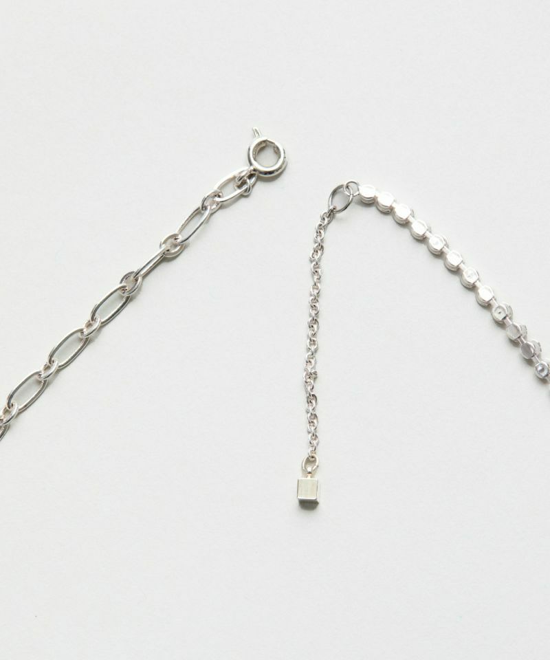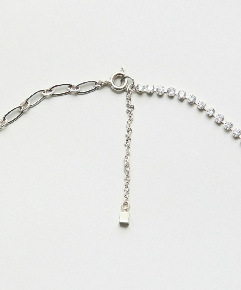 キラキラ揺れるオリジナルパーツをあしらった、Ornamentシリーズのネックレス。 左右アシンメトリーなデザインで、ビジューネックレスでもフェミニンになりすぎず、モードな雰囲気でお使いいただけます。 爪のないダイヤレーンを使用しているため、服への引っかかりが気になりにくく、着用しやすいのも魅力です。