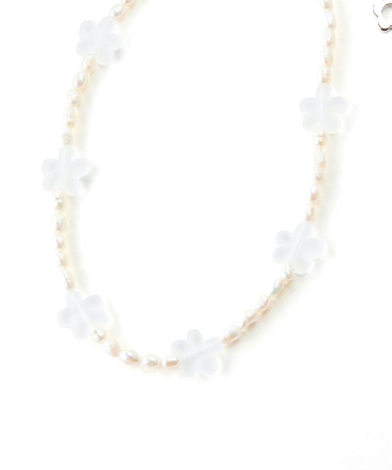マットな質感のフラワービーズと、やわらかな光沢が美しいパール風ビーズを組み合わせ、上品さと遊び心を両立させたデザインです。 留め具部分には小花チャームをあしらい、後ろ姿まで可憐なアクセントをプラス。 韓国らしい感度の高いデザインで、デイリーにも特別なコーデにも映える1本です。