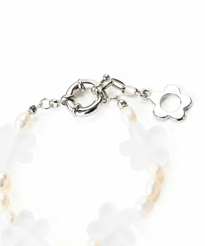 マットなフラワービーズとパール風ビーズが、手元に華やかさと可憐なニュアンスをプラス。 絶妙なサイズ感で、単品使いはもちろん、重ね付けにも映えるデザインです。 ネックレスとセットで合わせれば、より統一感のあるスタイリングが楽しめます。