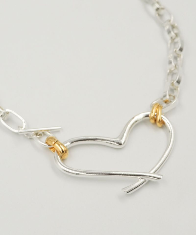 大きなハートモチーフに太めのチェーンでインパクトのあるデザインに仕上げたチョーカー。 さまざまなコーディネートに合わせやすく、シンプルなスタイリングの際にもアクセントになるアイテム。 単品ではもちろん、ロングネックレスと組み合わせてお使い頂くのもおすすめ。