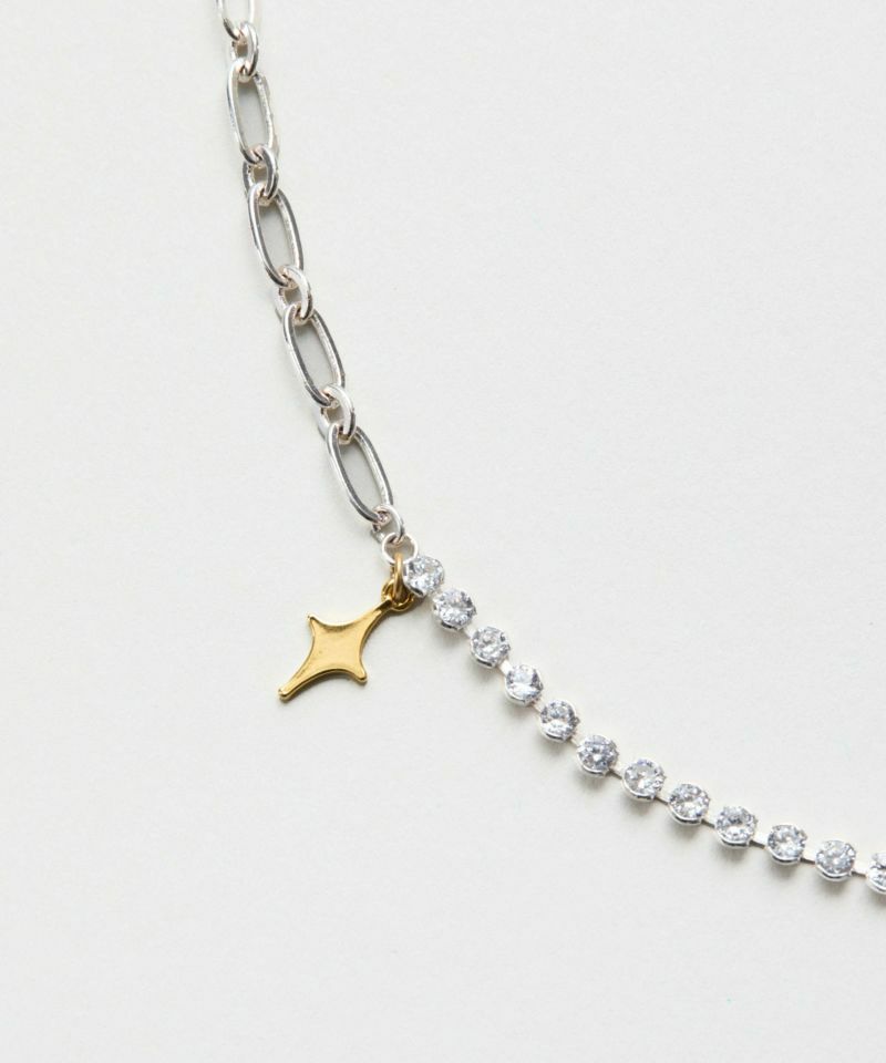 キラキラ揺れるオリジナルパーツをあしらった、Ornamentシリーズのネックレス。 左右アシンメトリーなデザインで、ビジューネックレスでもフェミニンになりすぎず、モードな雰囲気でお使いいただけます。 爪のないダイヤレーンを使用しているため、服への引っかかりが気になりにくく、着用しやすいのも魅力です。