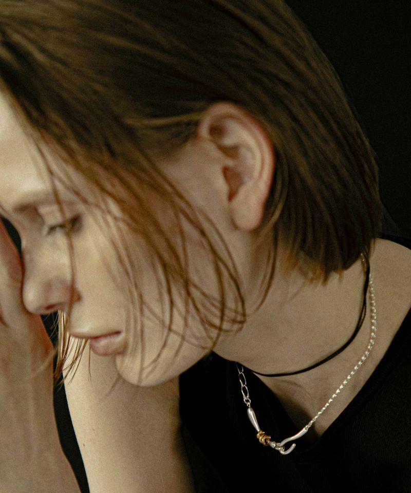 二種のチェーンで構成された表情のある作りで、オリジナルの留め具も引っかけタイプにしており、デザインの一部になっています。