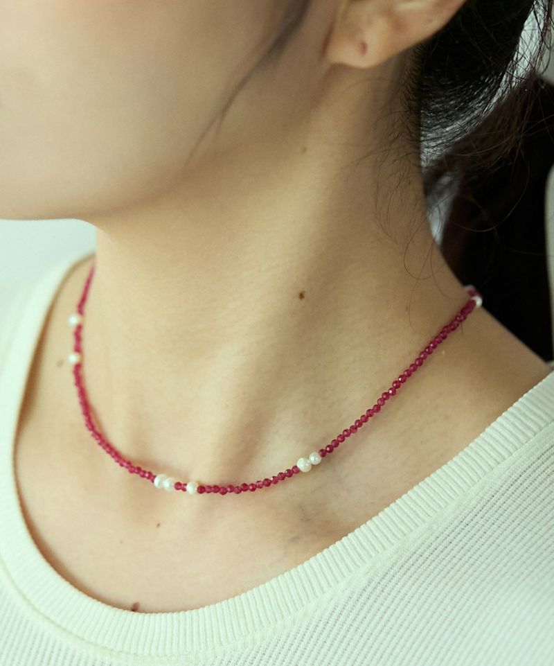 あえて不規則にパールを配置することで、首元に抜け感をプラスします。