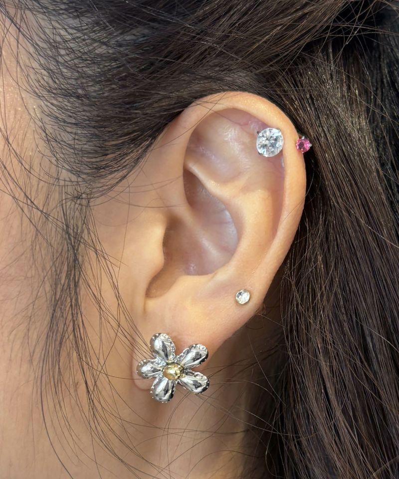 フラワーモチーフが可愛いピアス。 スタイリッシュな印象のメタル素材で、コーディネートを選ばず合わせられるのも◎ シンプルなデザインで取り入れやすく、程よいボリューム感で顔周りのアクセントになってくれます。