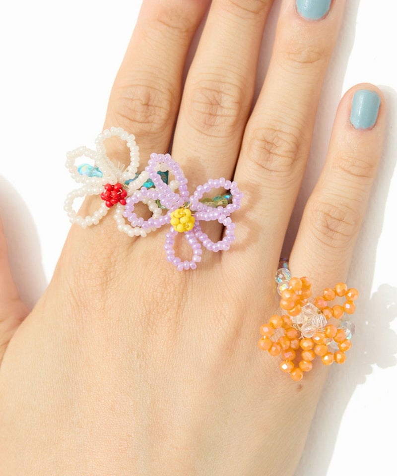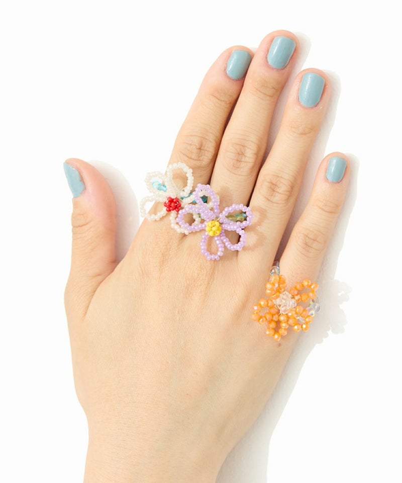 フラワーモチーフをかたどったビーズが愛らしいリング。 手元にお花が咲いたようなボリューム感のあるシルエットで、つけるだけでぐっと華やかな印象に。 カラフルな色合いで、シンプルコーデやカジュアルコーデの引き立て役になります。 ホワイト…11号相当 オレンジ...14号相当 パープル...10号相当