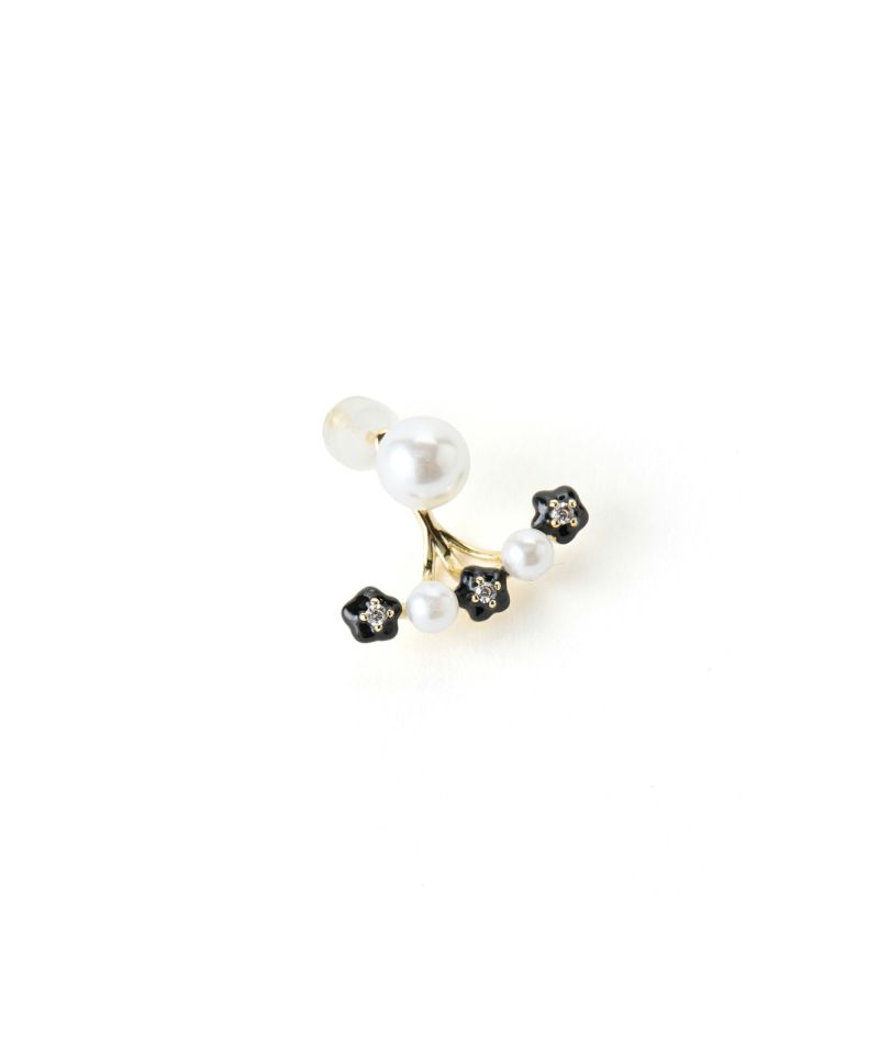 パールとモチーフが華やかに配置されたデザインピアス。 耳元の後ろでモチーフが立体的に広がる個性的なシルエット。 小ぶりなサイズ感ながら、華やかで女性らしい雰囲気を演出してくれます。 日常使いはもちろん、ちょっとしたオケージョンシーンにもおすすめです。