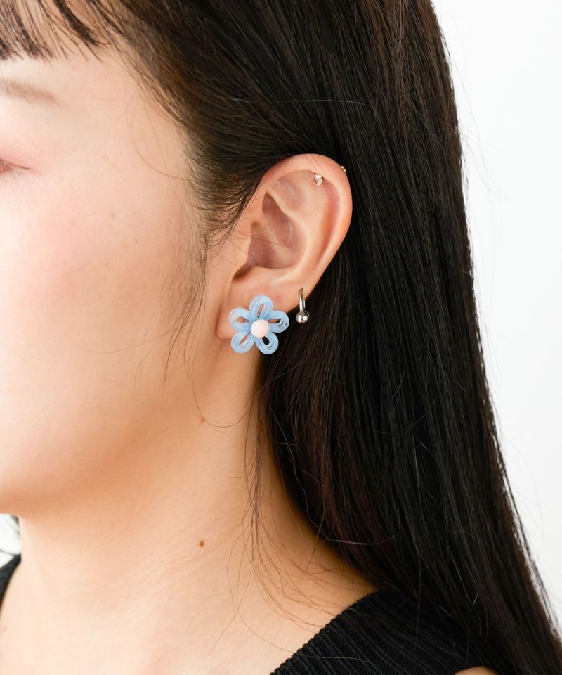 ぷっくり感と透け感がキュートなクリア素材のフラワーピアス。 ビビッドなセンターカラーがアクセントになって、耳元をパッと明るく彩ります。 軽量でつけ心地もよく、デイリーからフェスやイベントまで幅広く使える万能アイテム。 パステル×ビビッドの配色がポイントです。