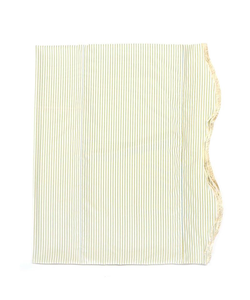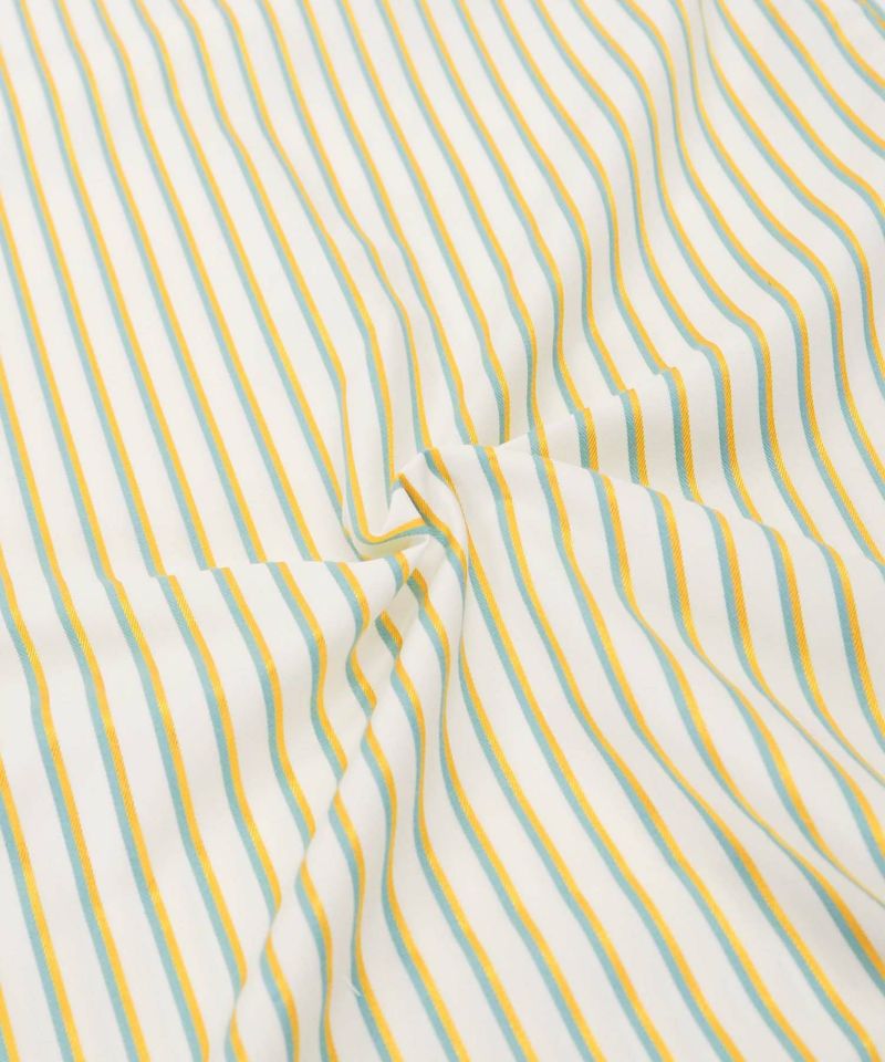 クリーンな印象のストライプに、なみなみデザインの裾とサテンリボンの組み合わせがポイント。