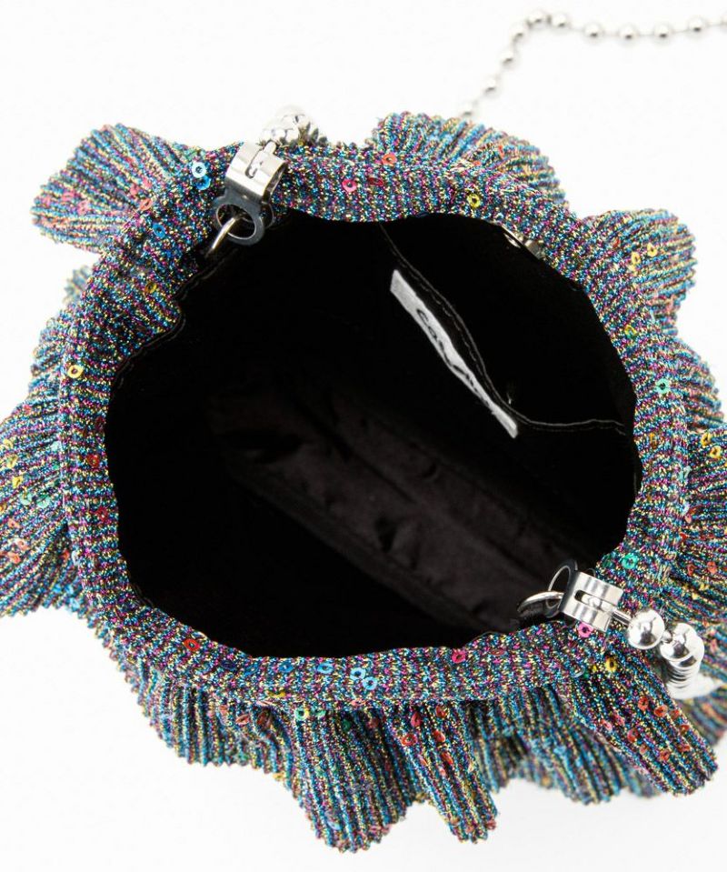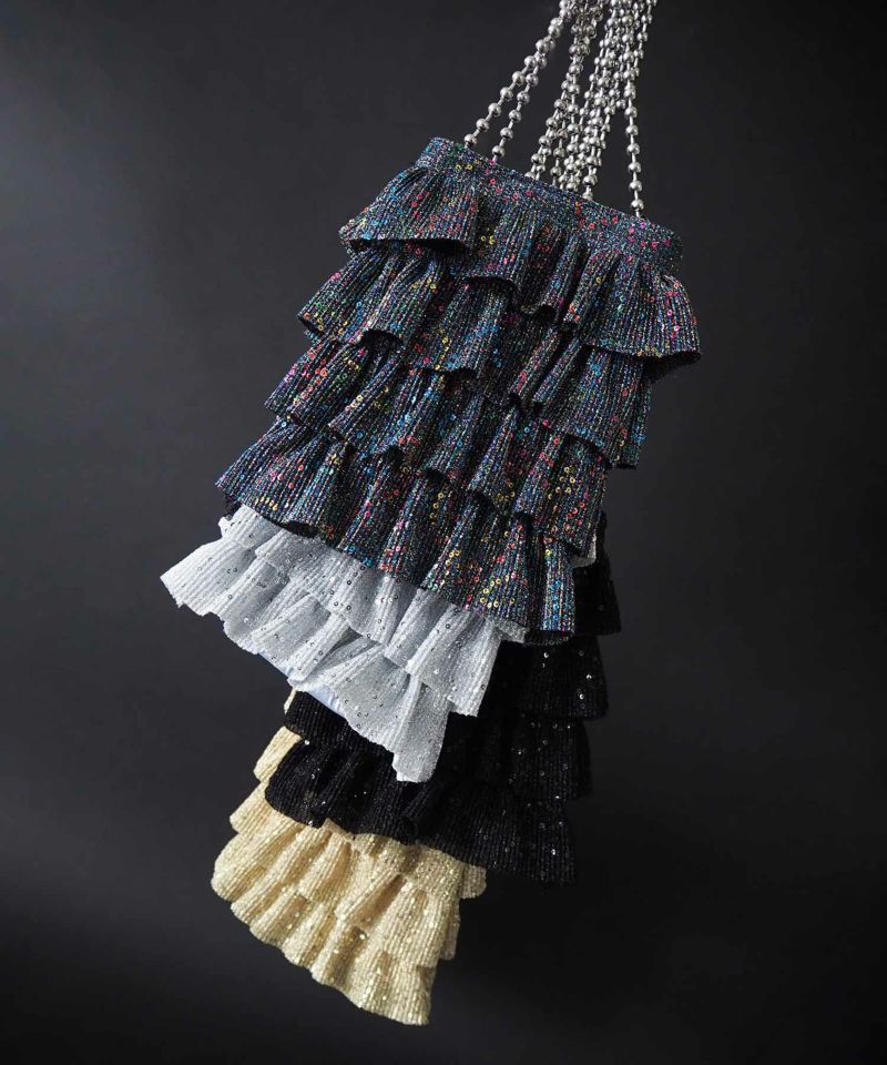 Casselini定番のフリルポシェットから、メタリックヤーンとスパンコールを編み込んだプリーツ素材が登場。