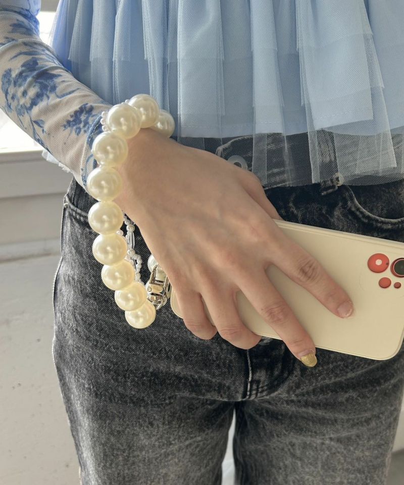 大きなビーズと、繊細なスカラップ編みをセットにしたハンドストラップです。
