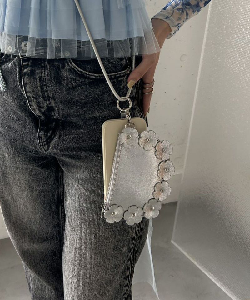 立体的なお花のモチーフが可愛らしいポーチと、シンプルな丸紐に仕上げたショルダー。 甘くなりすぎない組み合わせで、幅広いテイストに合わせることができます。 ポーチとショルダーは取り外し可能で、その日のコーディネートや用途に合わせて使い分けるのもおすすめです。 カラビナがついているため、お気に入りのストラップを加えるなどアレンジも楽しんでいただけます。