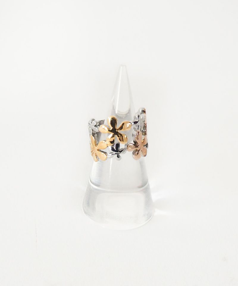 フラワーモチーフを繋いだ存在感のあるデザインのリング。 メタルが醸し出す大人な雰囲気と、小振りなお花モチーフの可愛らしさのコンビネーション○ ミックスカラーが華やかで、シンプルコーデのアクセントになってくれます。