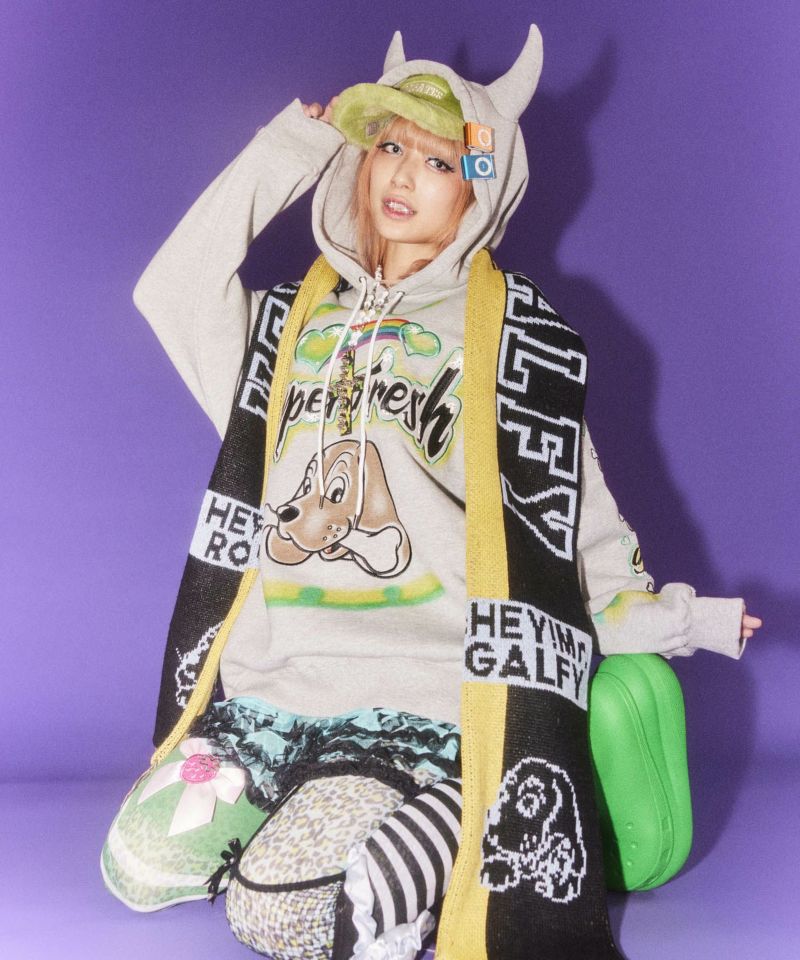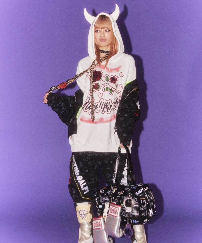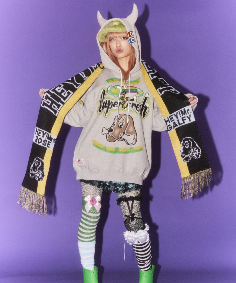 「そこまでやる!?」ってくらい刺繍とスプレーで盛り盛りに仕上げた、GALFY × HEY!MrsROSE コラボフーディー。