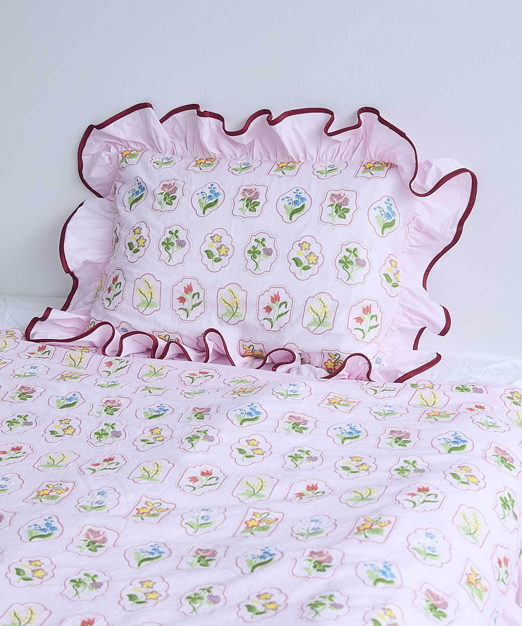 繊細なフラワー刺繍が目を惹く、フリルの布団カバー。