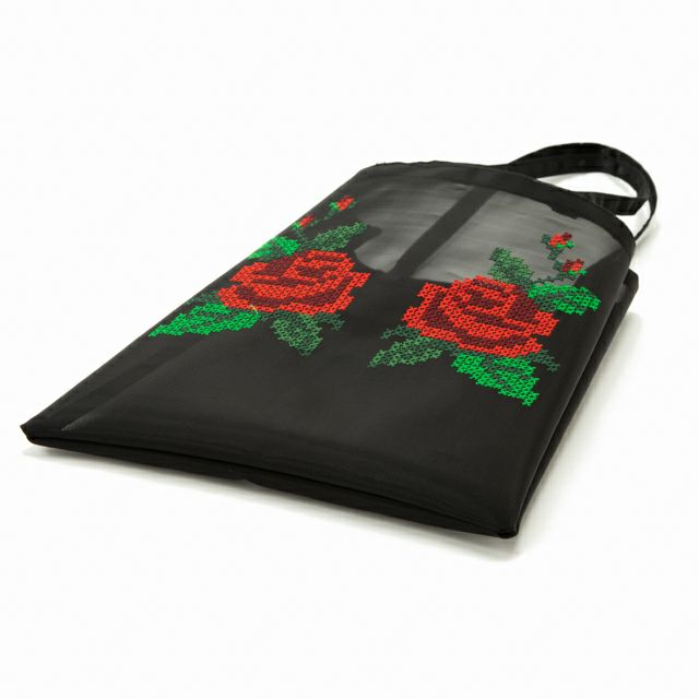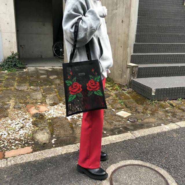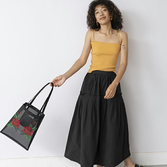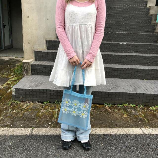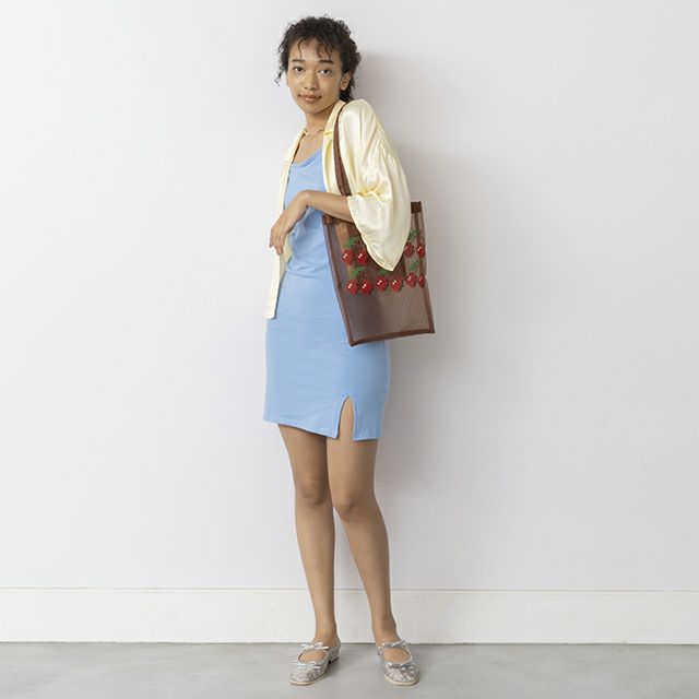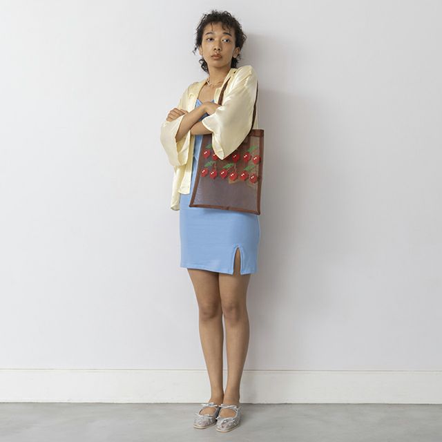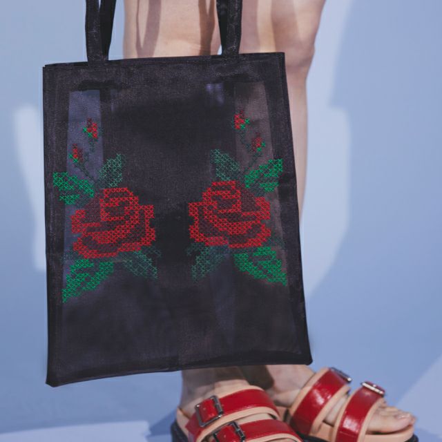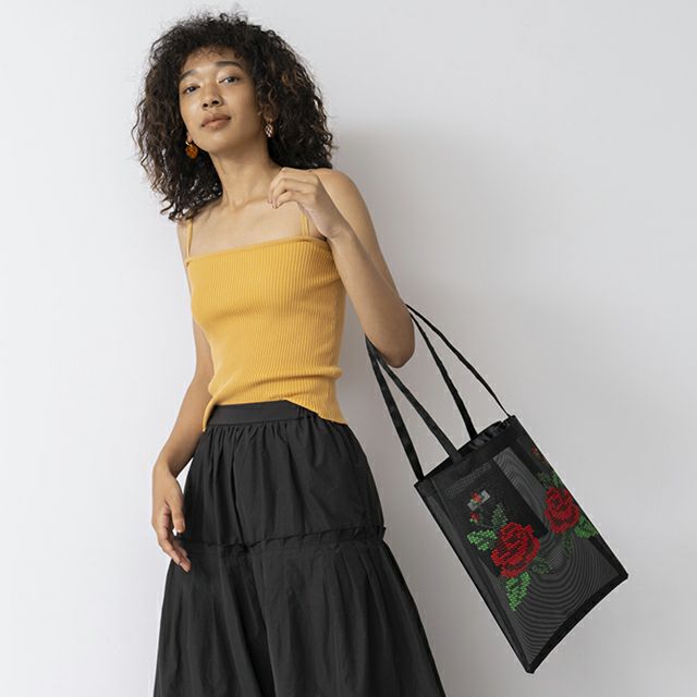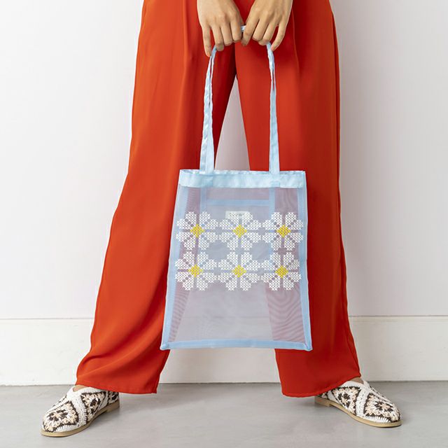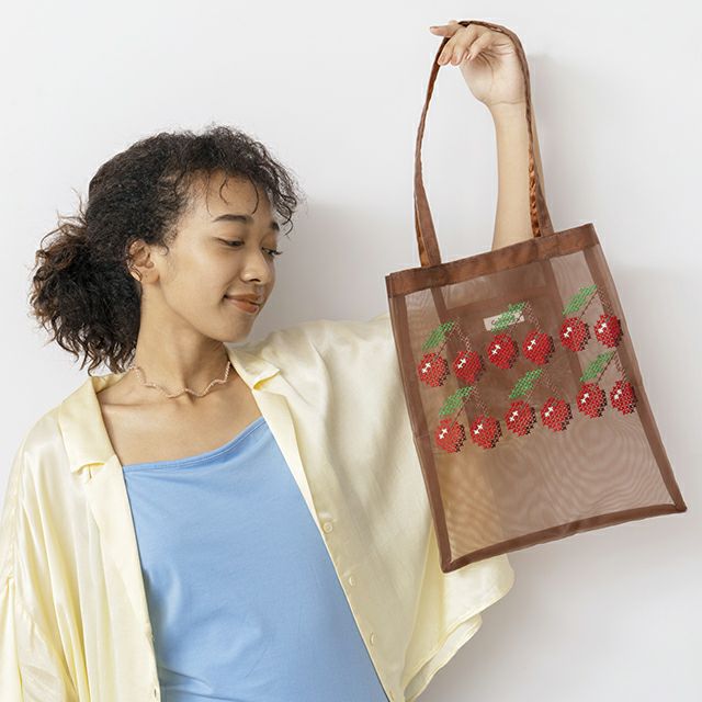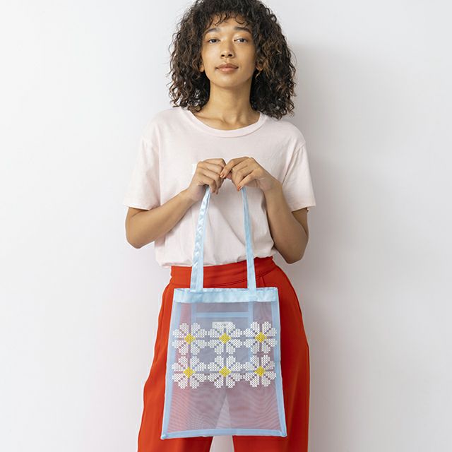 春夏らしい清涼感のあるチュール素材のトートバッグにクロスステッチ刺繍を施したアイテム。チュール素材なので重さがなく、ストレスフリーにお持ちいただけます。