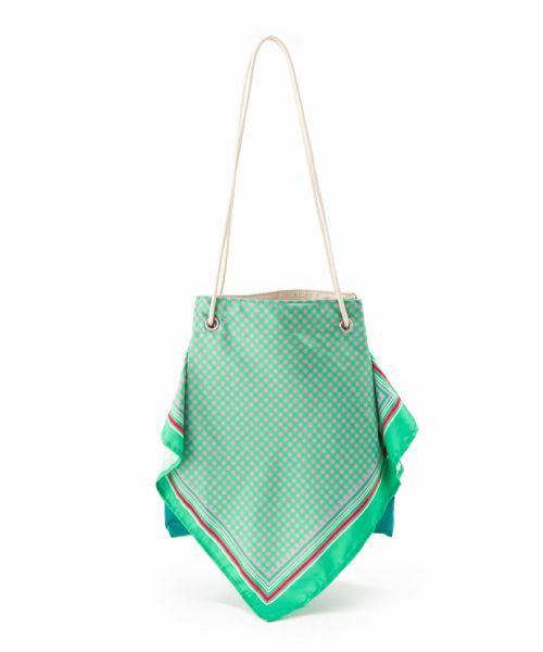 注目されているスカーフのバッグは、ひらひらと揺れる形状がポイント。カラーと柄は遊び心があり、コーディネートのアクセントに。紐の通し方によって、サイズを調整でき、A4サイズまで入れることができます。ショルダーでお使いいただけ、光沢のあるスカーフは上品さもあるので、コーディネートの幅も広がります。