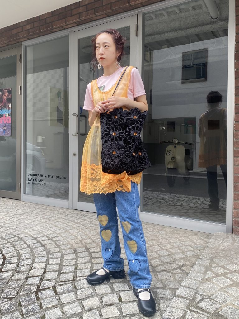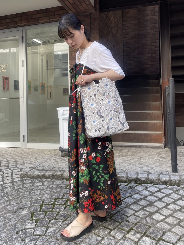 大きなフラワーモチーフのワッペンをパッチワークした、インパクト大のトートバッグ。