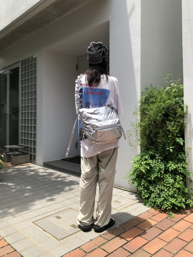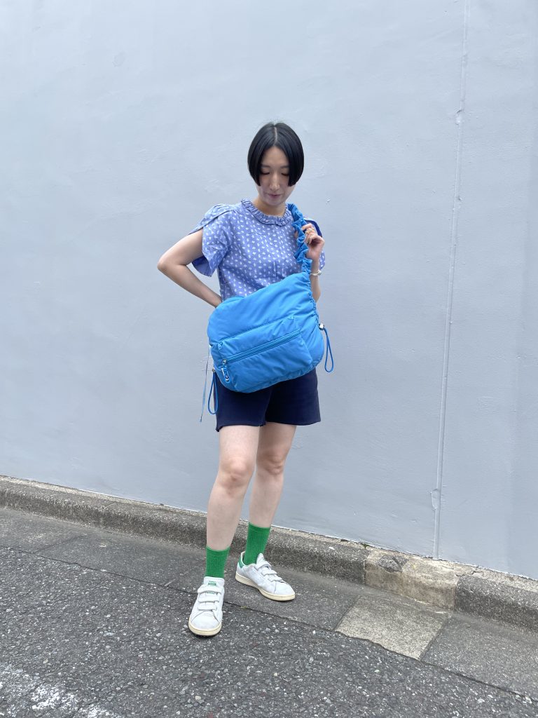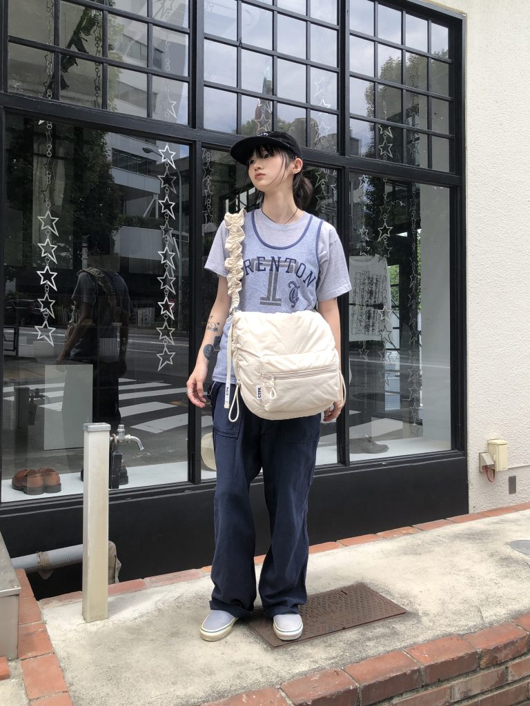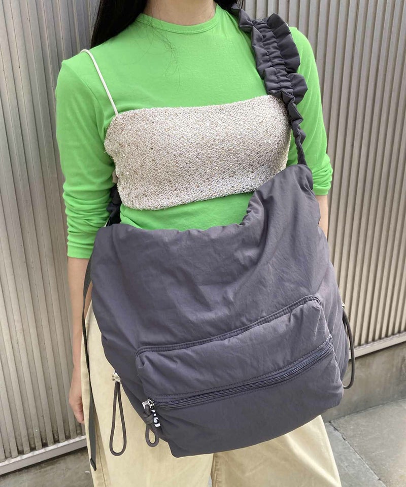 スポーツライク×フェミニンの組み合わせが目を惹くビッグショルダーバッグ。