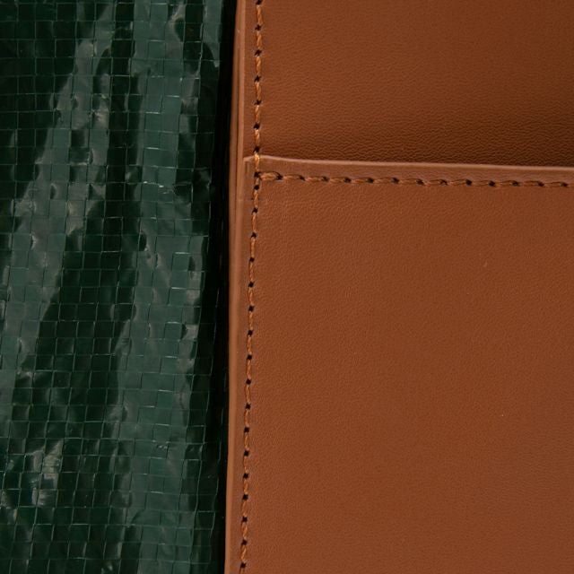 フェイクレザーとナイロン素材のコンビが印象的なトートバッグ。 荷物をたっぷり収納できる大きさと、マチのあるデザインで、ちょっとしたお出かけにおすすめです。ポリエステル素材を使用し撥水性と丈夫さをプラス。 コーディネートのアクセント使いに是非。