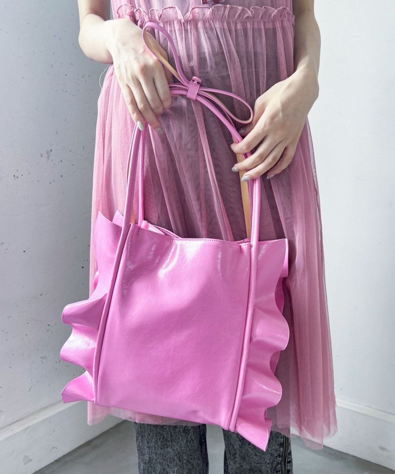 フリルをあしらった、使いやすいミドルサイズのトートバッグ。 クラッキング(ひび割れ)したようなラフな雰囲気のエナメル素材を使用しています。 太マチx横長のフォルムと、楽に肩掛け出来る長めのハンドルで実用性も◎ 肩にちょこんと乗って見えるリボンモチーフは取り外し可能です。 ハンドルの付け根に取り付けるのもオススメ。