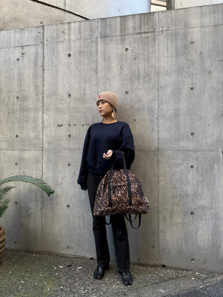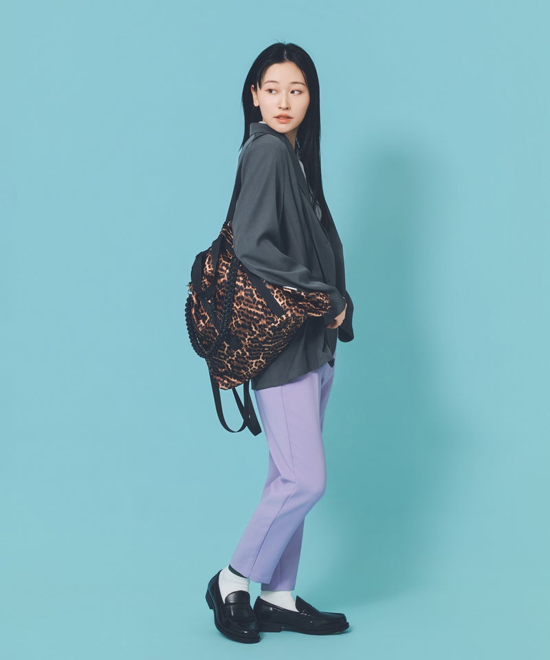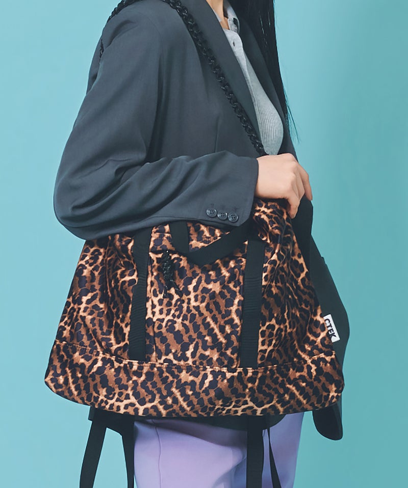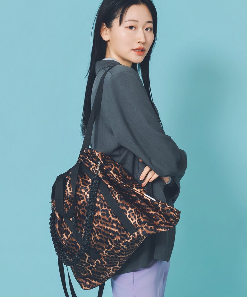 撥水素材を使用したナイロン3WAYスクエアトートに、大人っぽいレオパード柄がシックな表情をプラス。