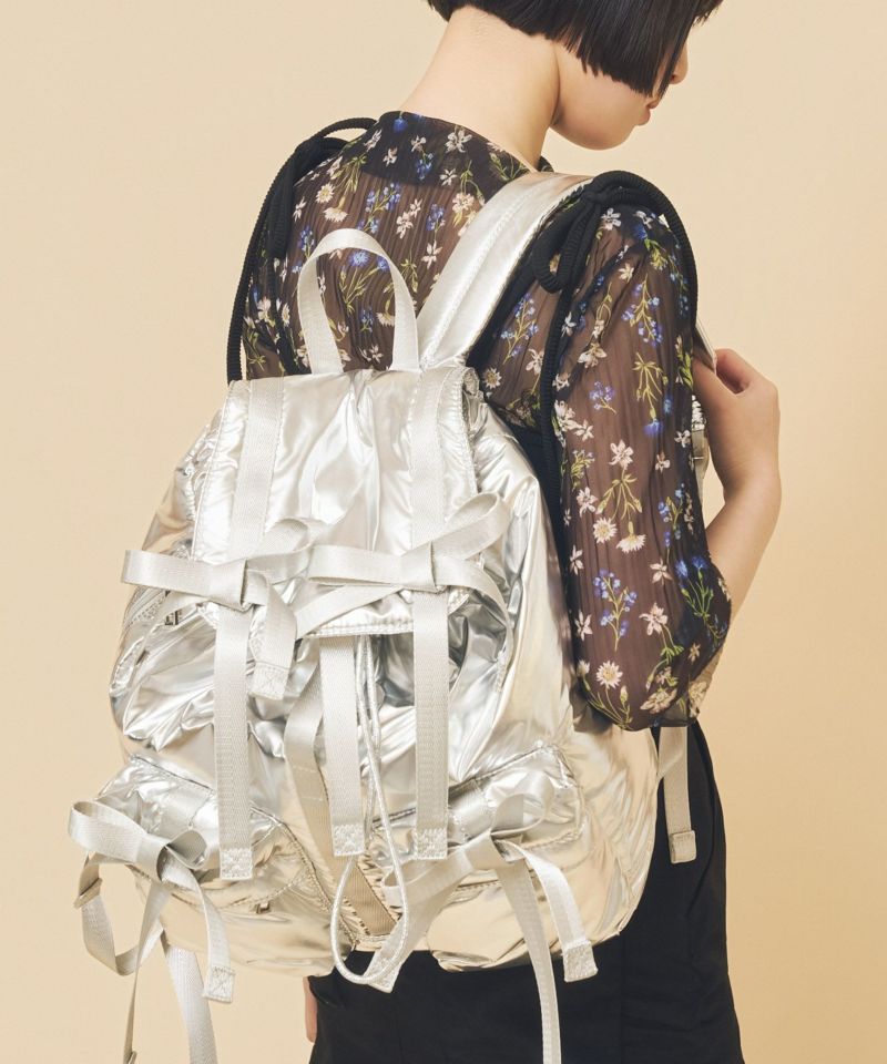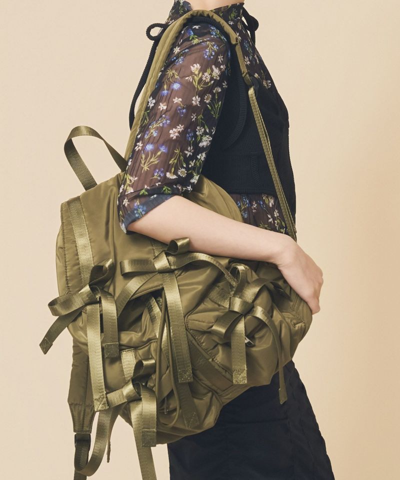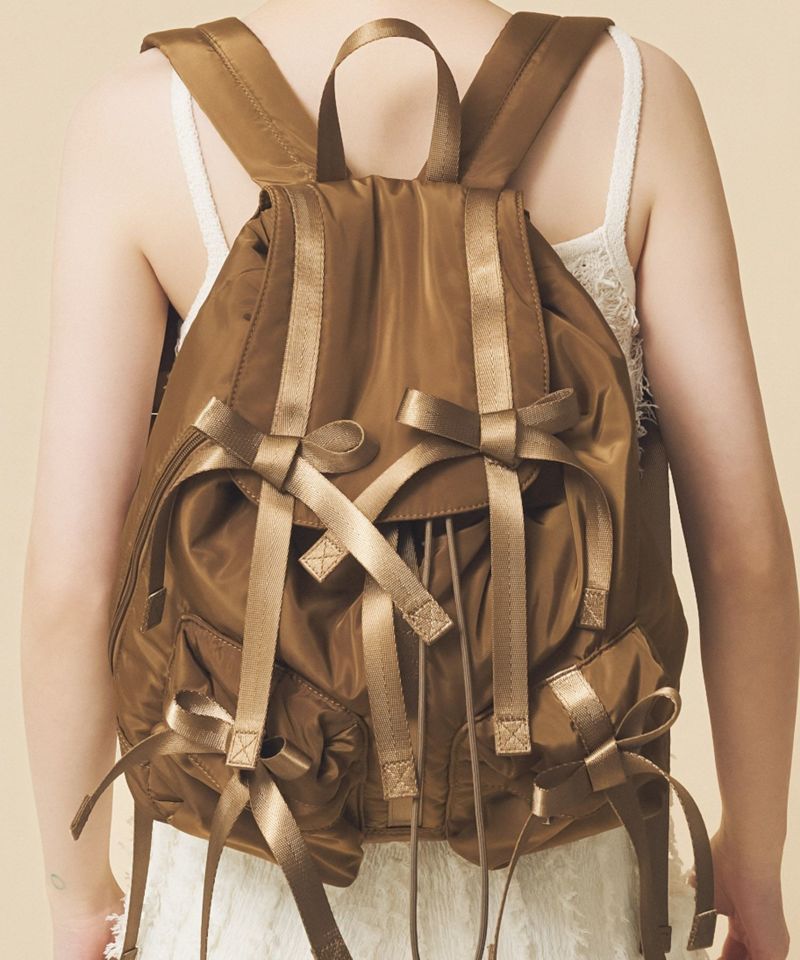 トレンドである複数のリボンがポイントのバッグパック。