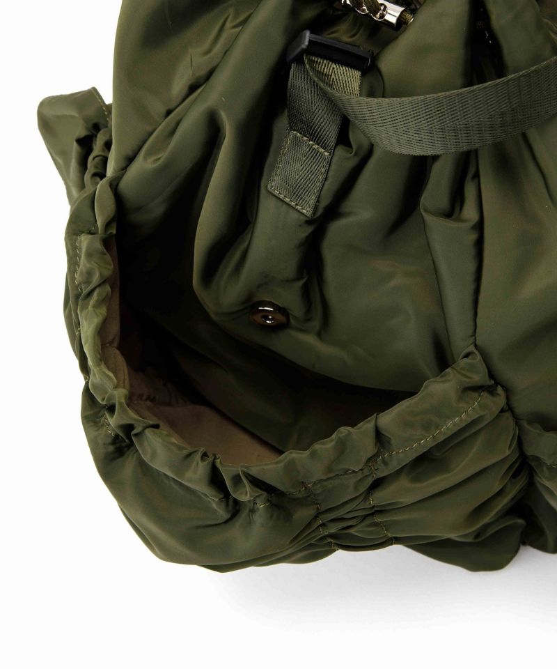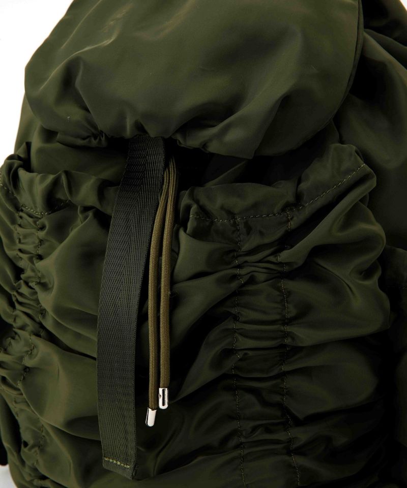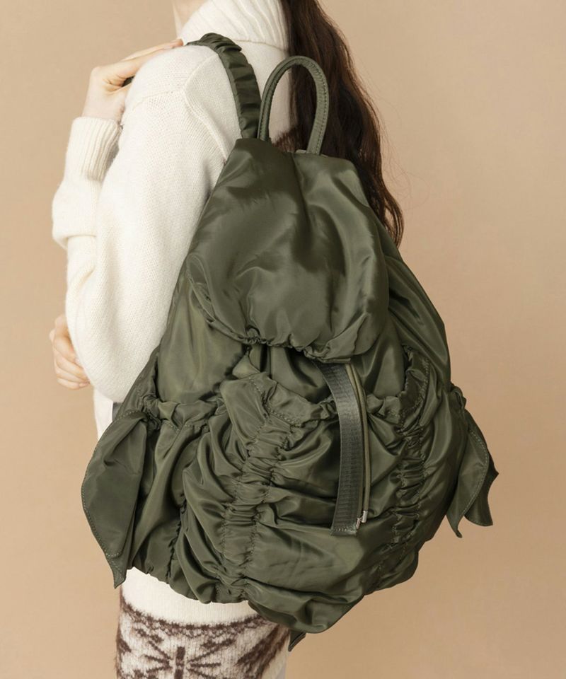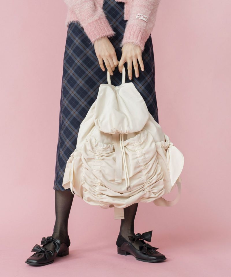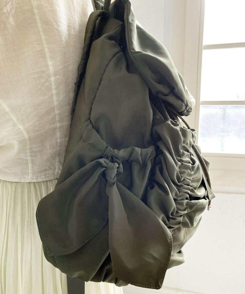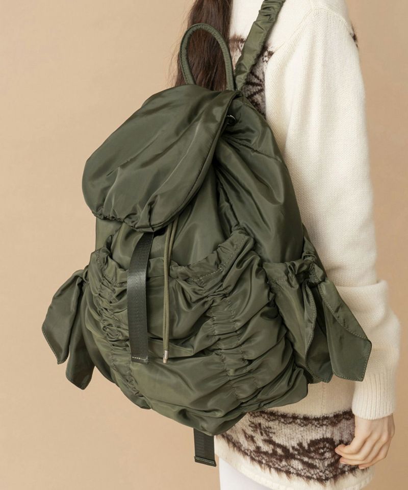 大きなシャーリングポケットがポイントのバックパック! A4も入るサイズで、ペットボトルや日傘などすぐに出したいものが入るポケットがついているのも嬉しいポイント。 カジュアルなお洋服はもちろん、ガーリーなテイストのお洋服とのスタイリングもおススメです!