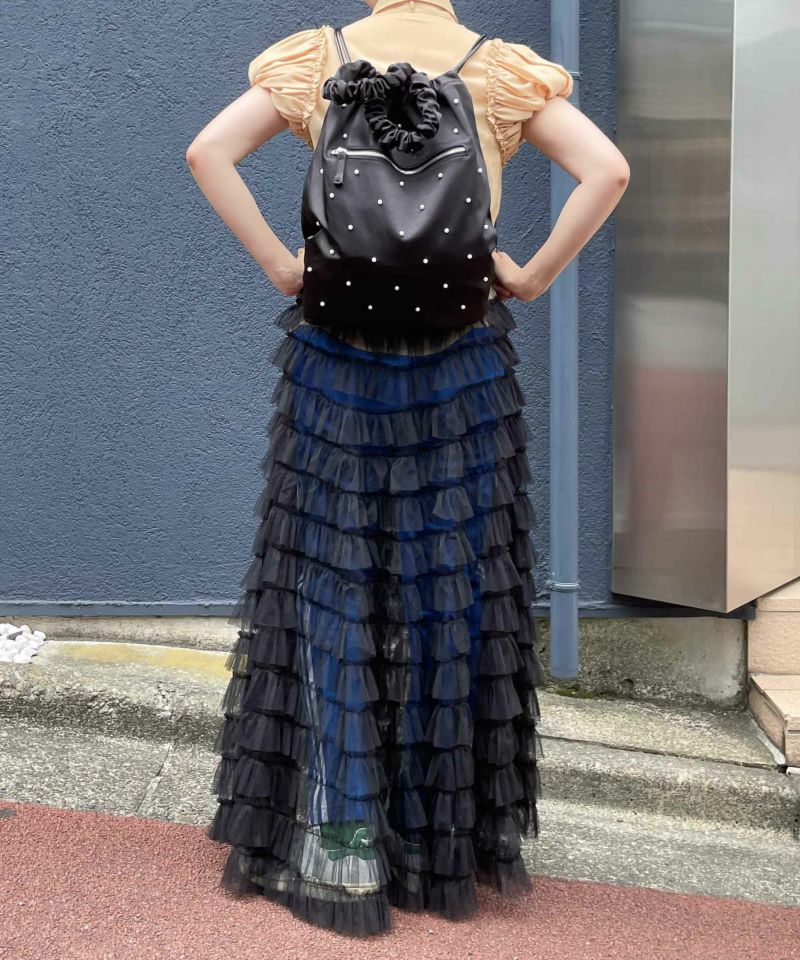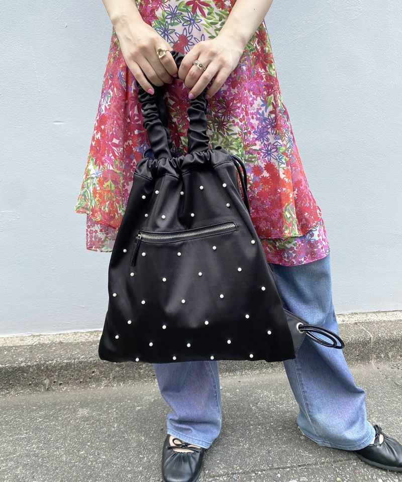 光沢感のある柔らかいサテン生地にパールが散りばめられたナップサック。