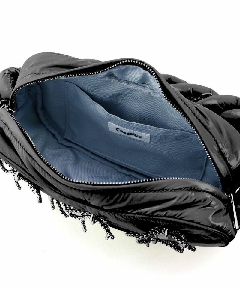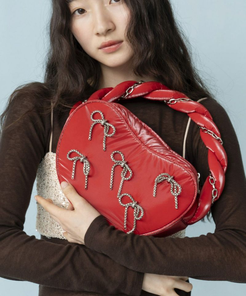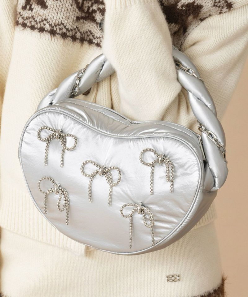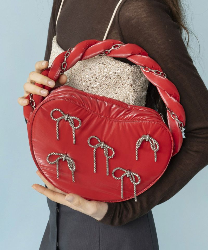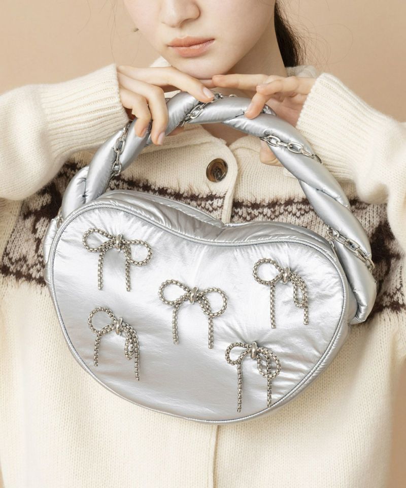 たくさんのチェーンリボンと、ねじねじとチェーンを巻き付けた持ち手がキャッチーなハンドバッグ。 歩くたびに一緒に揺れるリボンと、甘くなりすぎないハートのシルエットがキュートなアイテムです! コンパクトな見た目ながらマチがしっかりあるので、お財布やスマホ・ポーチなど必要なアイテムはしっかり収納できるサイズ感です。