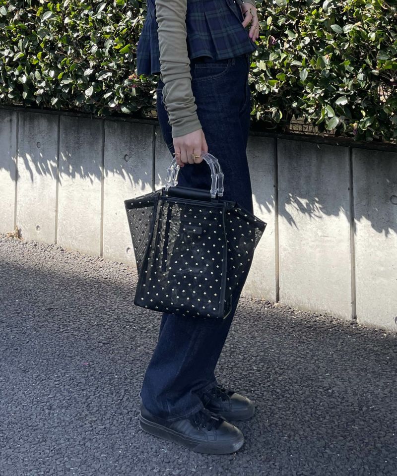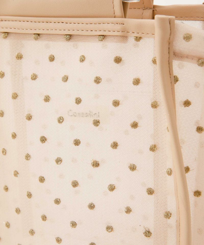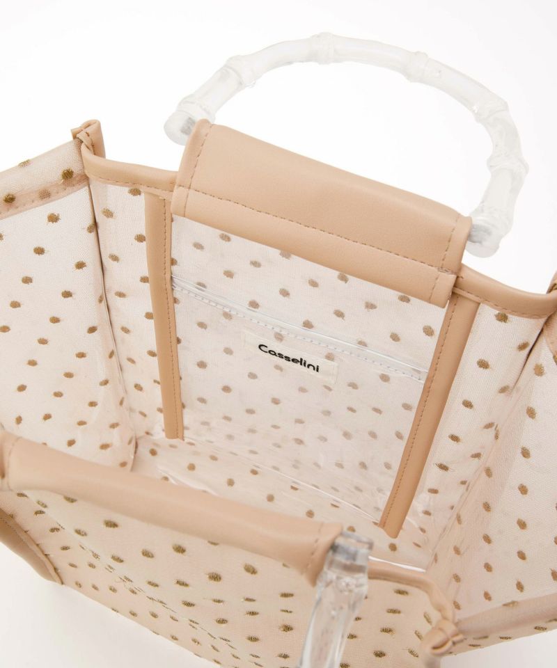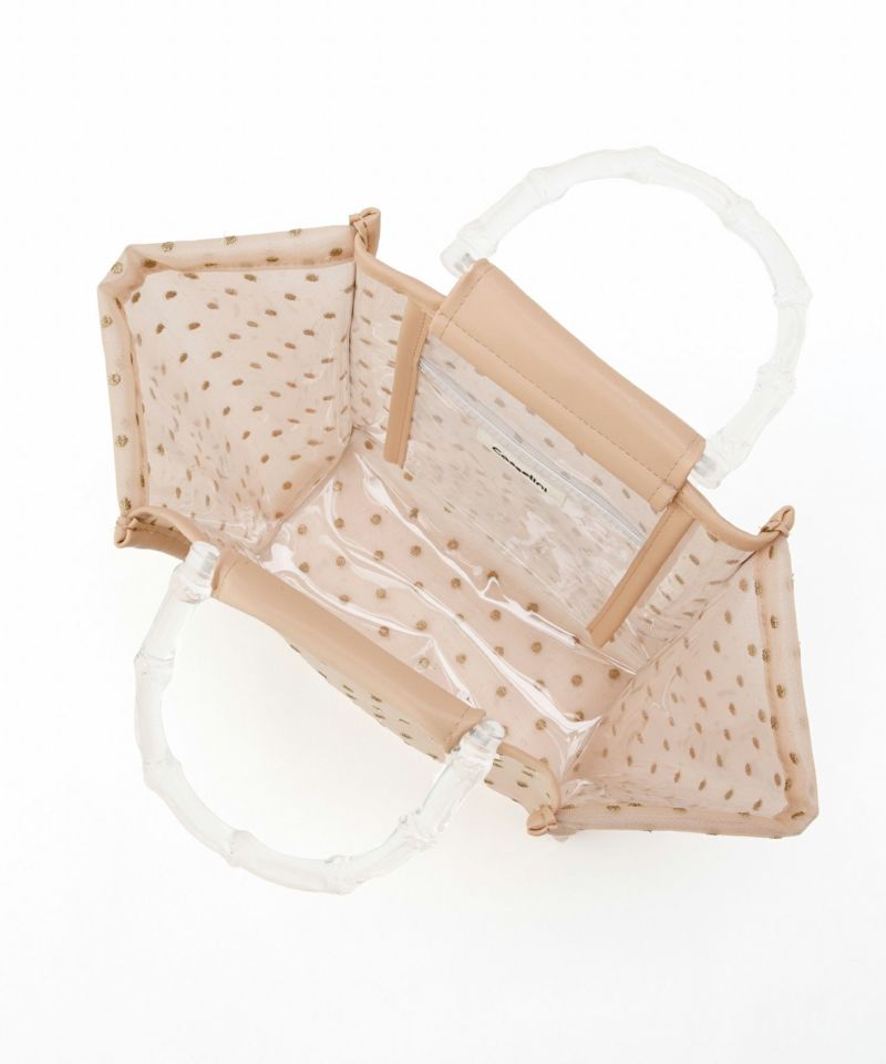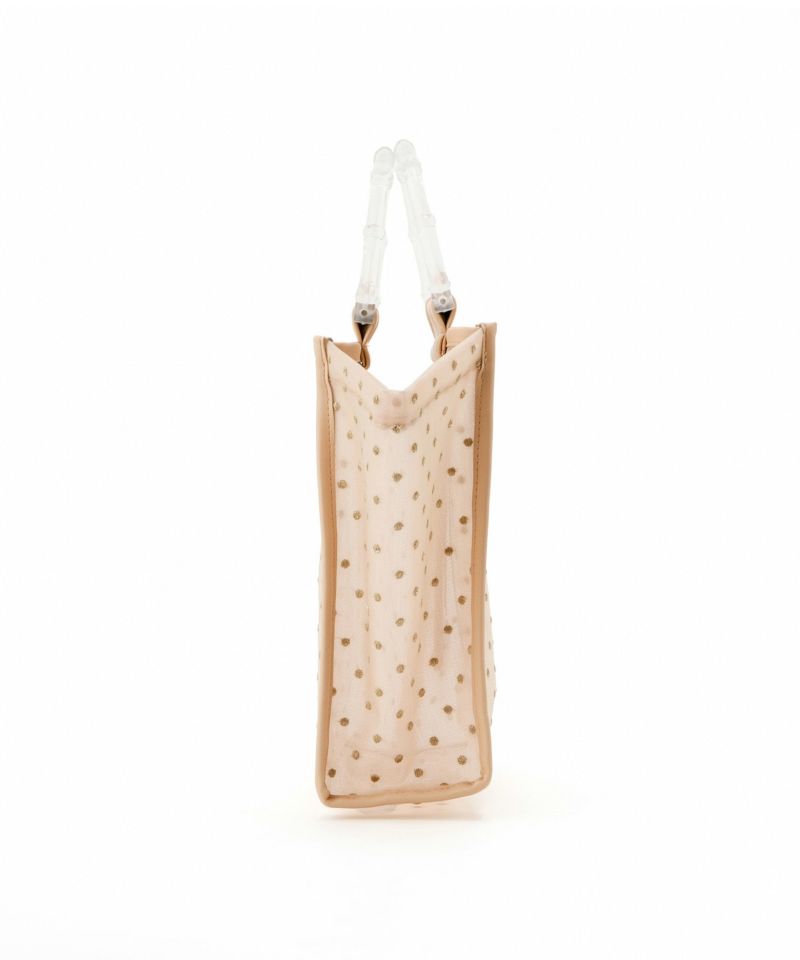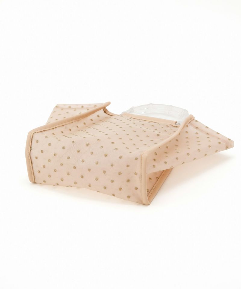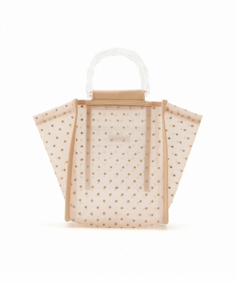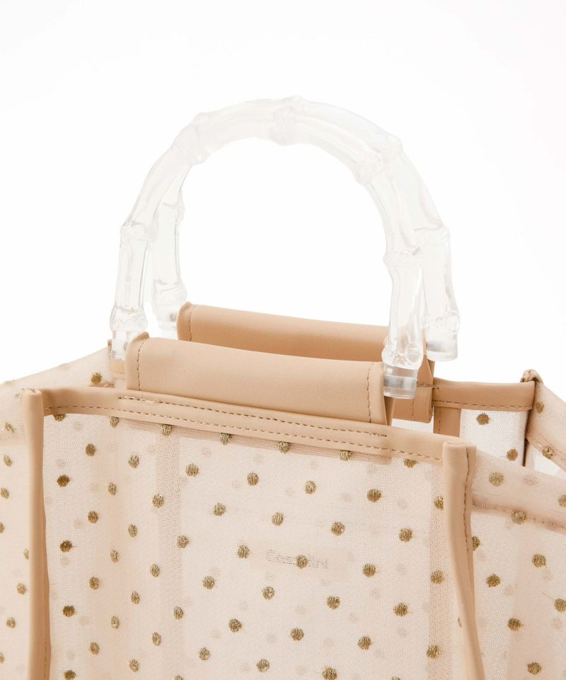 夏らしさを感じられるクリアハンドルや、チュール素材を使用した夏にピッタリのハンドバック。 本体のチュールにはラメ糸を使用したドット模様が刺繍してあり、キラキラしたデザインが魅力。 ペットボトルを入れられるサイズ感で、内ポケット付きで細かなものも収納可能です〇