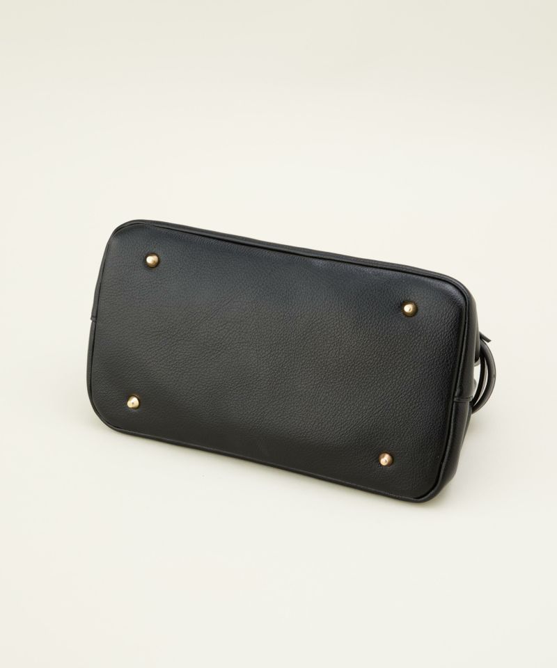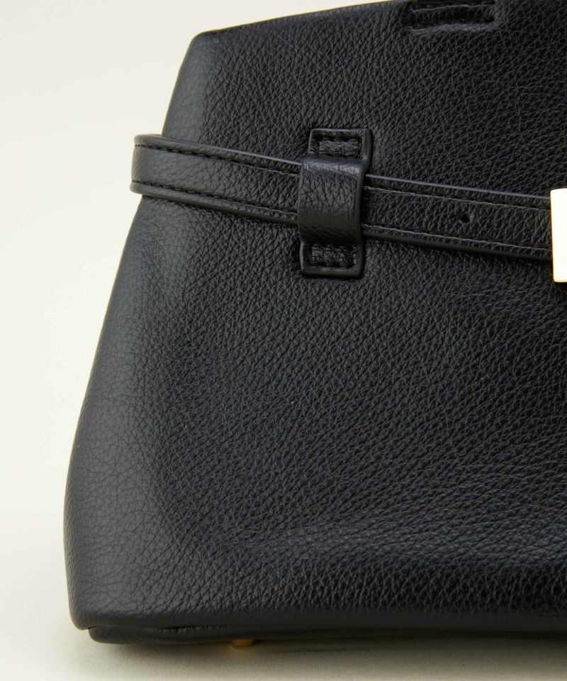 程よいシボ感のある上品な素材を使用し、表面には金具ベルトを効かせて大人顔なワンポイントに。