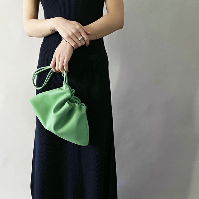 バゲットバッグのような横長のシルエットとくしゅっとした巾着型の2wayで使えるアイテム。その日の気分やコーディネートに合わせて使い分けて!