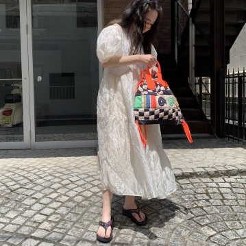 柄のテンションに合わせて、バッグの形もヴィンテージショップで見かけるようなナップサックデザインに。バックパックより気軽に持て、荷物の少ない日・多い日ともに活躍すること間違いなし!肩紐をあえて垂らしてハンドバッグとして持つのもおすすめです。