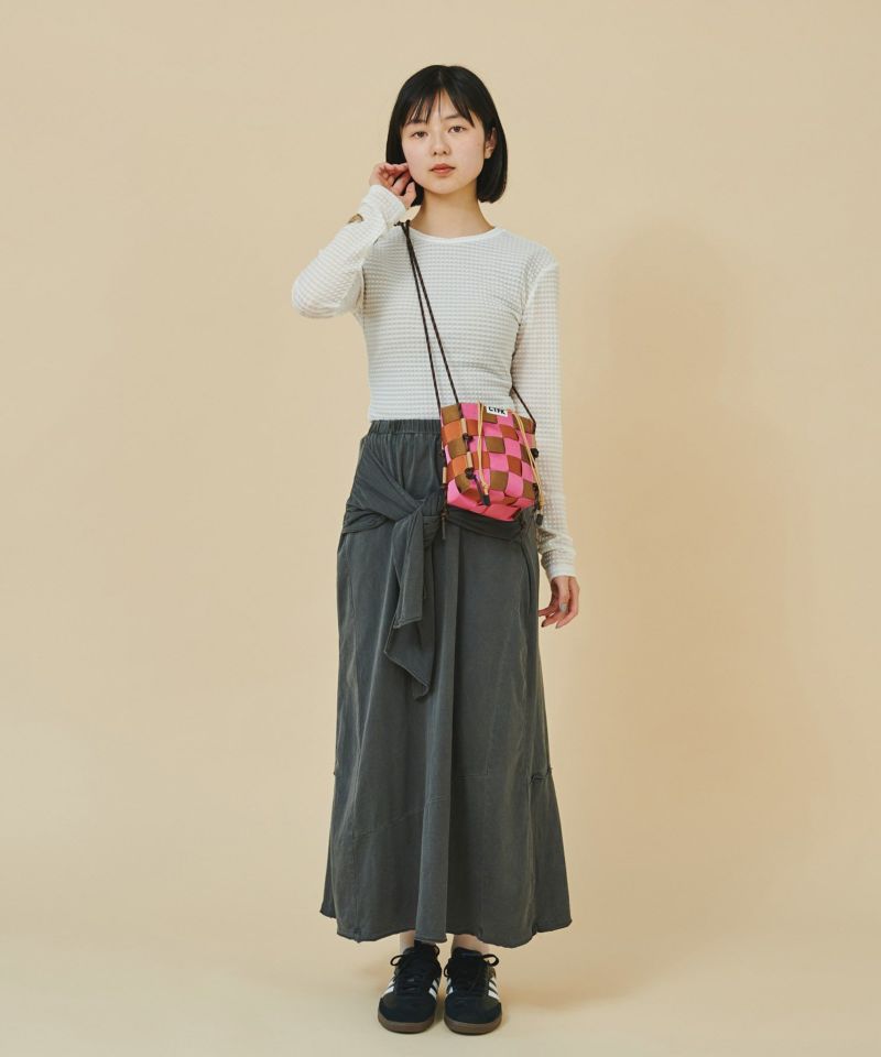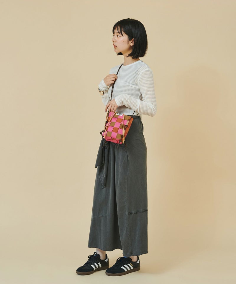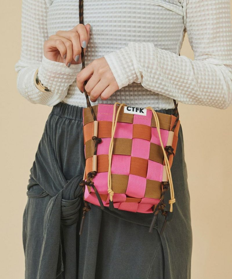 格子状にテープを織り込んだデザインがポイントの巾着ショルダー。