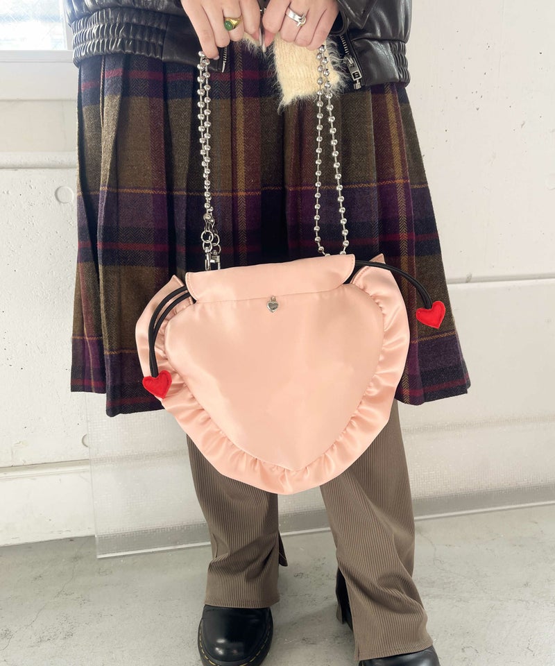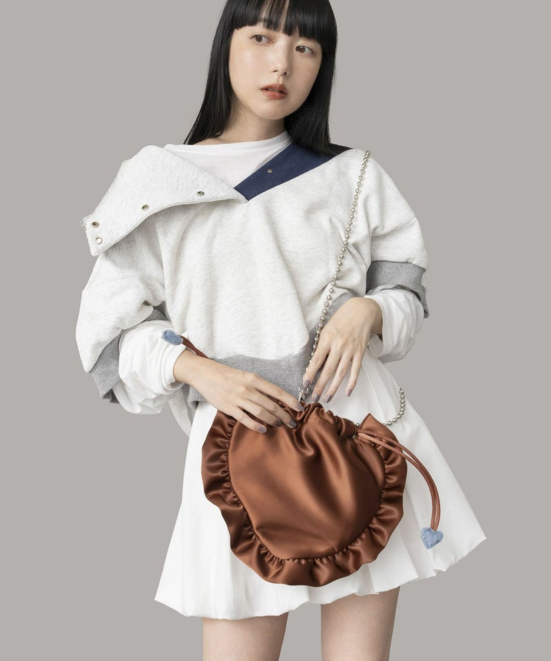口元をしぼるとハート型のシルエットになる、コロンとしたフォルムが目を惹く巾着BAG。 コード先のモフモフ素材のハートモチーフがキュンポイント。 口元には中央にメタルハートチャーム付き。 取り外しできるボールチェーンショルダー付で2WAYでお楽しみいただけます。 オケージョンシーンはもちろん、シンプルなコーディネイトのポイント使いとしても◎