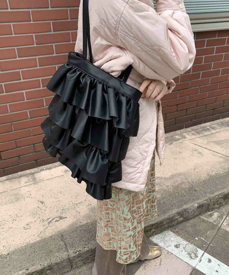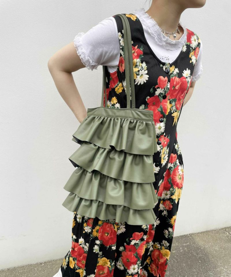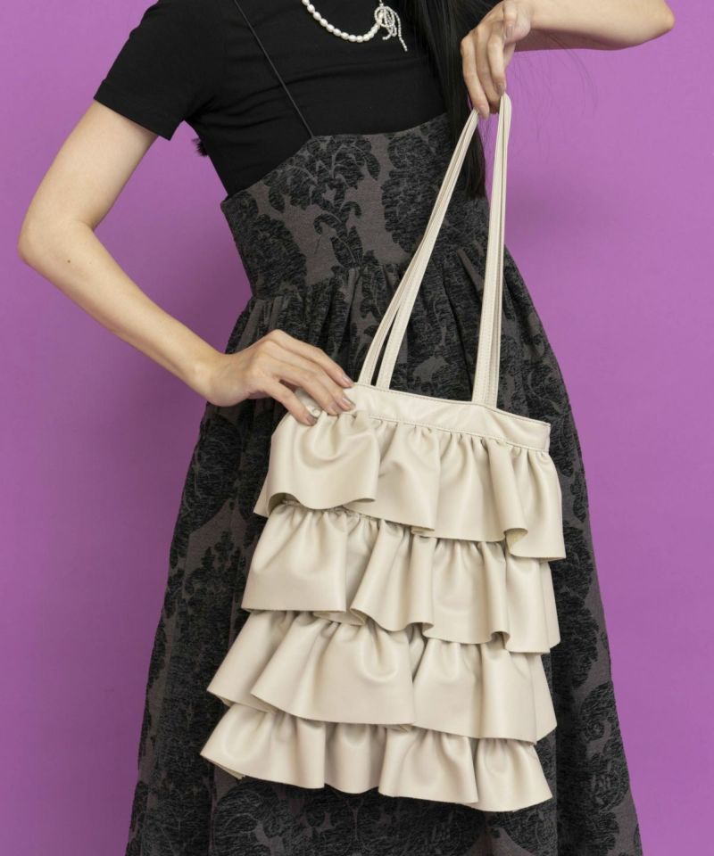 ラメ素材から、光沢を抑えた合成皮革に素材変更し、大人も持てるフリルバッグに。