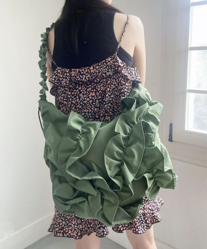 ボリュームたっぷりなフリルを前面にあしらったバッグはコーディネートの主役に。 フリルたっぷりですが、素材はカジュアルなコットン素材を使用しているため、甘すぎずデイリー使いしやすいアイテムに仕上がりました。 大容量で頑丈&内装にはファスナー付きポケットもあり、実用性も抜群です。 ショルダーストラップはサイドのコードで長さを調節可能です。