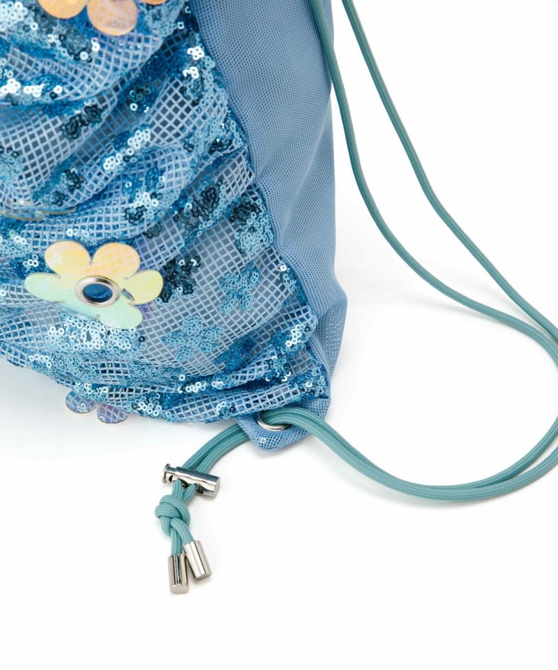 キラキラ素材とお花モチーフでシーズンムードを盛り上げてくれるナップサック。