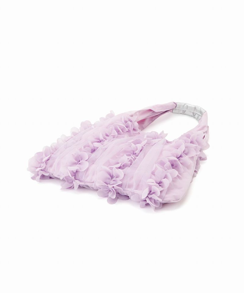 フラワーパーツをフリル状にした、ゴージャスなテープをふんだんに使用したトートバッグ。 甘いフリルにナイロン素材を取り入れることで、甘すぎず程よいカジュアル要素をプラス。 春夏のレジャーシーンが楽しくなるデザインです!