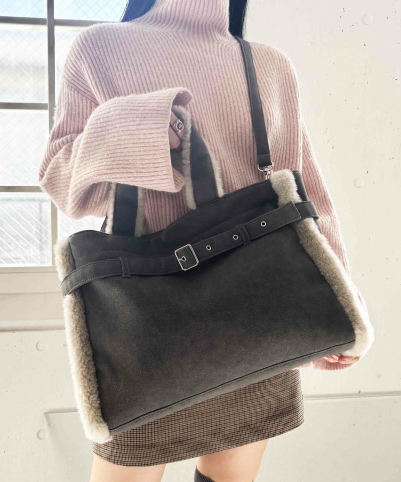あたたかみのあるフェイクファーと、ベルトデザインが目を引くトートバッグ。