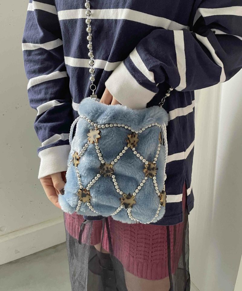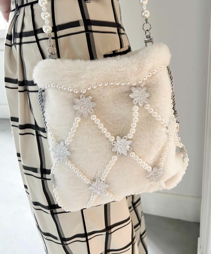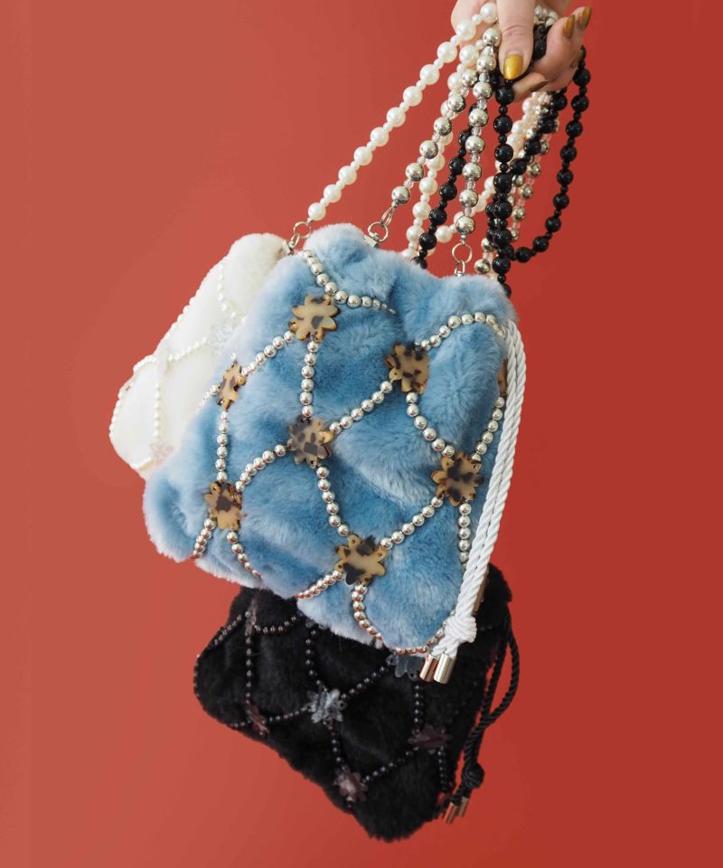 みっしりとした羊風のフェイクファーに、オリジナルのお花風のパーツとビーズを組み合わせたネットが魅力的なショルダーバッグ。