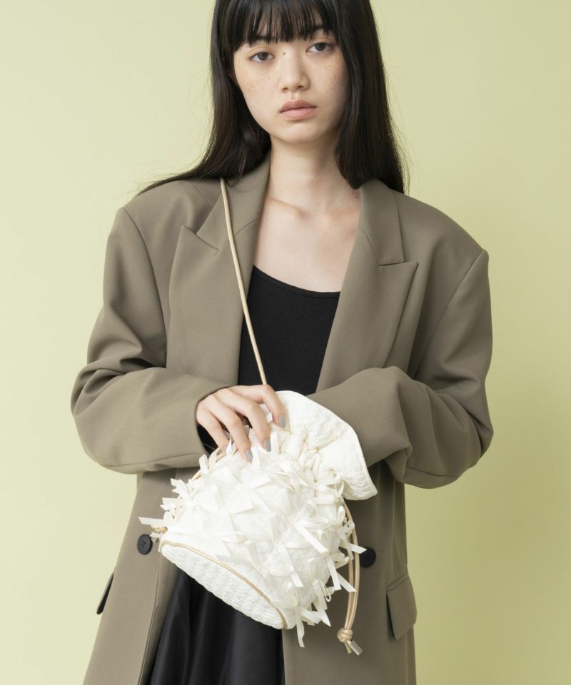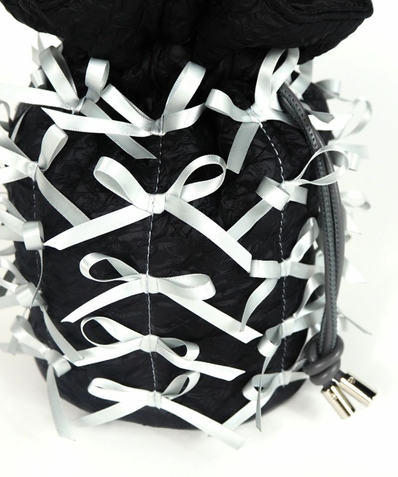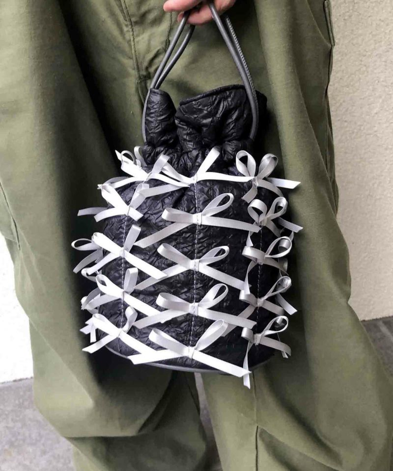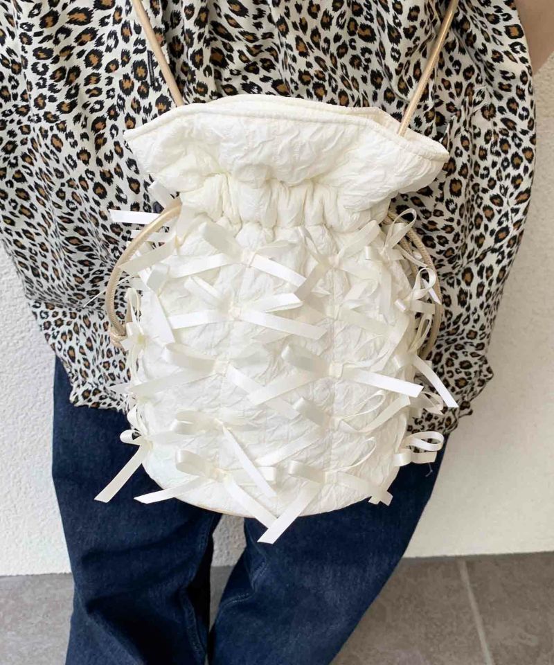 小さなリボンが散りばめられたトレンドライクな巾着バッグ。 巾着型なので荷物の出し入れがしやすく、コロンとしたフォルムが可愛いです。 見た目以上に、二つ折り財布やポーチなど入るちょうどいいサイズ感。 シックなコーディネートにも合わせやすい素材感が甘すぎない印象でGOOD! 気分に合わせて、ハンドバッグやショルダーバッグにも変わる2way仕様。 普段使いにもオケージョンシーンにもおすすめです。