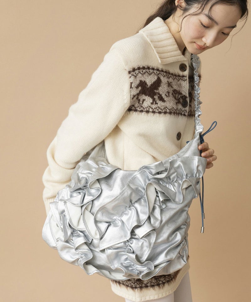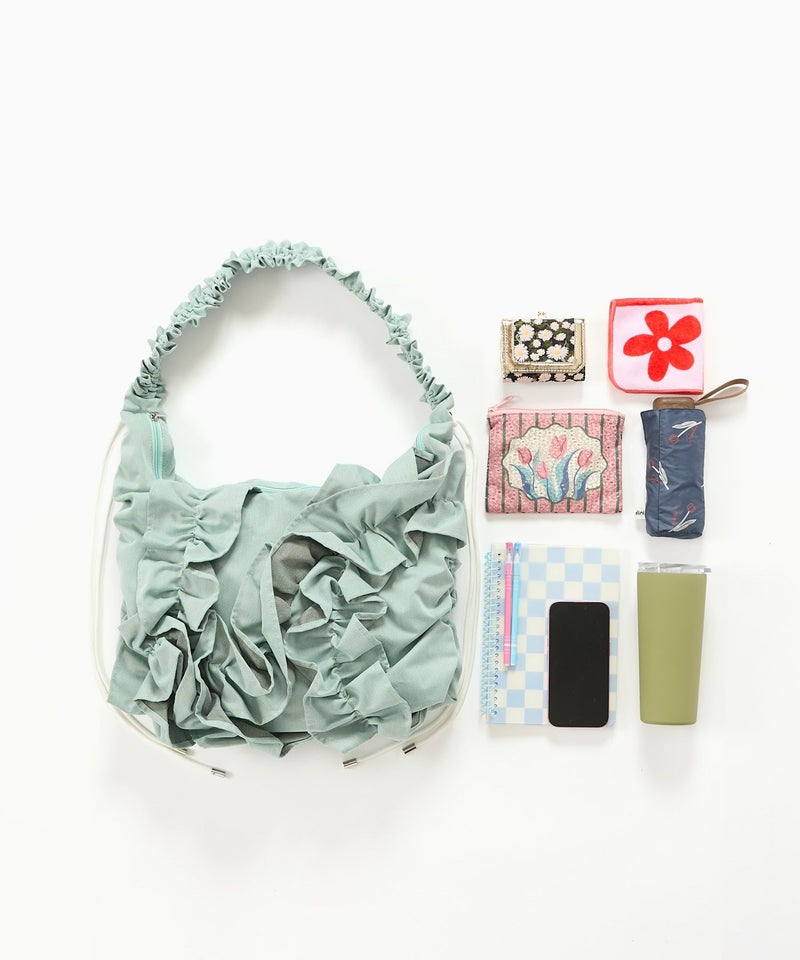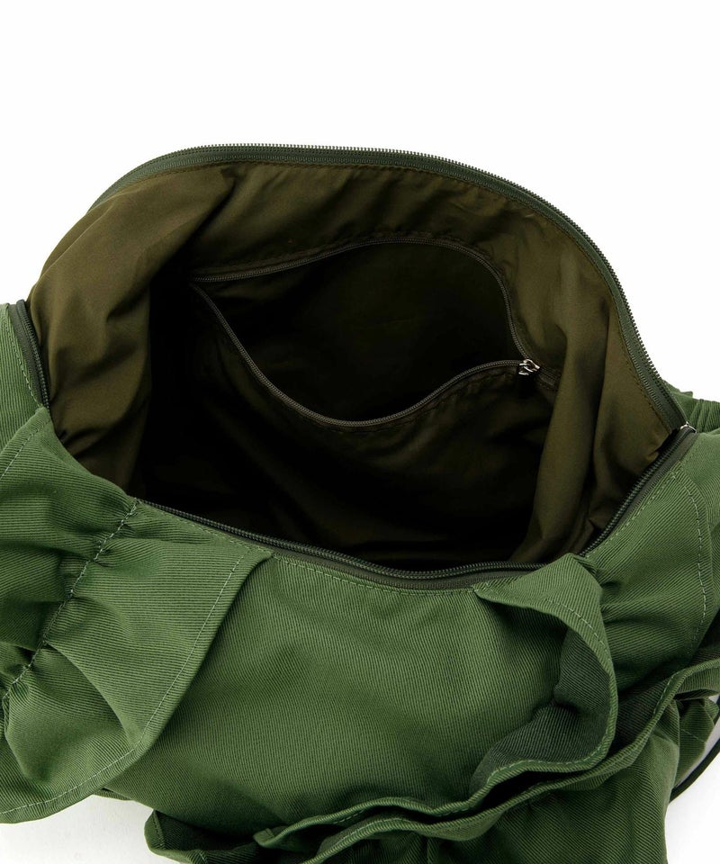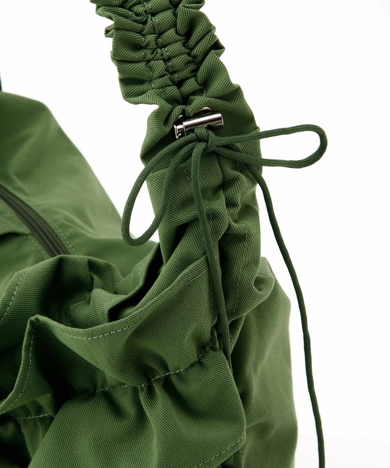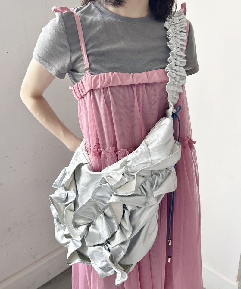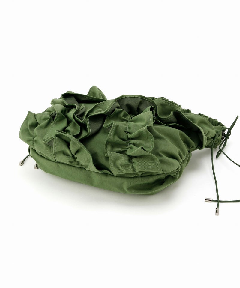 ボリュームたっぷりなフリルを前面にあしらったバッグはコーディネートの主役に。 フリルたっぷりですが、素材はカジュアルなコットン素材を使用しているため、甘すぎずデイリー使いしやすいアイテムに仕上がりました。 大容量で頑丈&内装にはファスナー付きポケットもあり、実用性も抜群です。 ショルダーストラップはサイドのコードで長さを調節可能です。