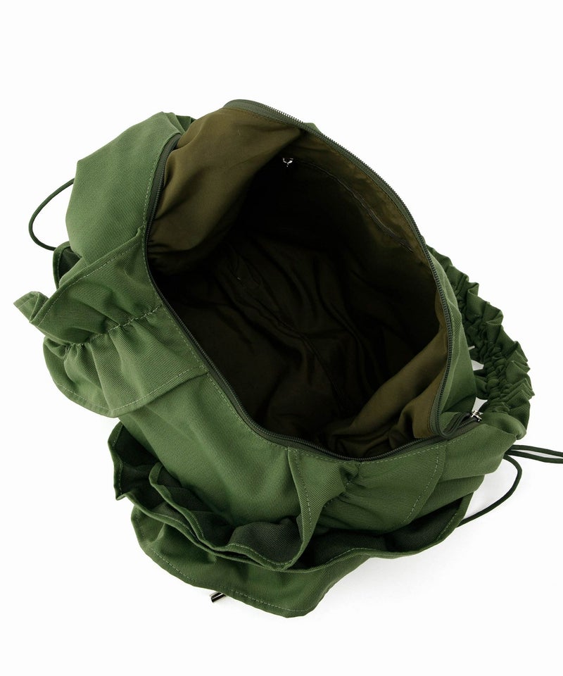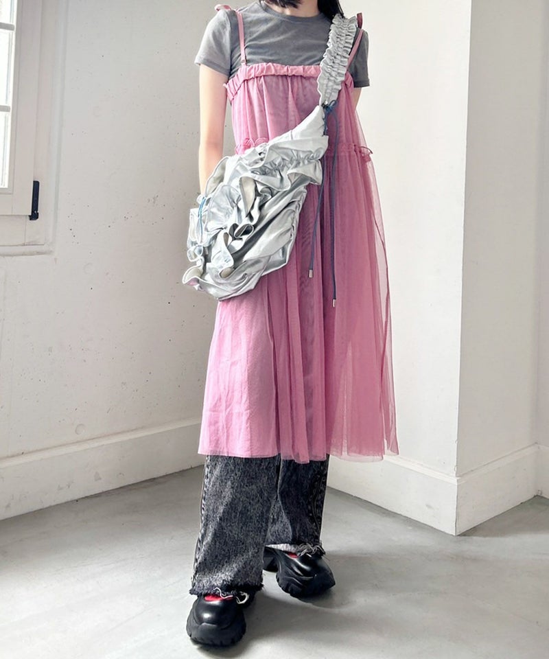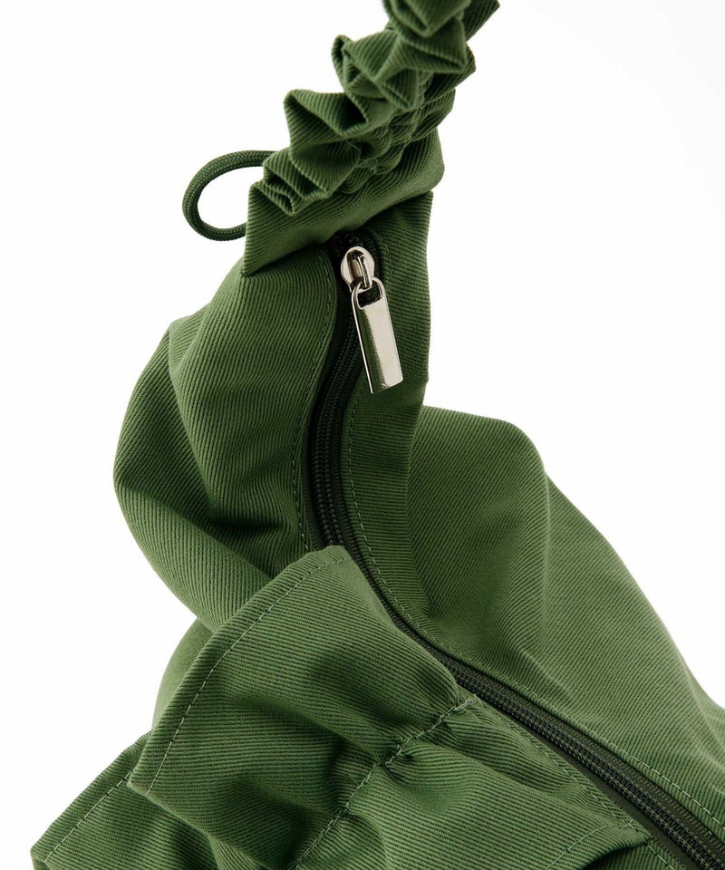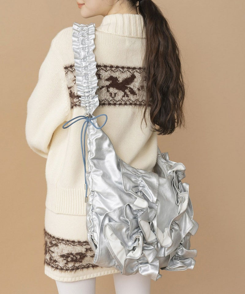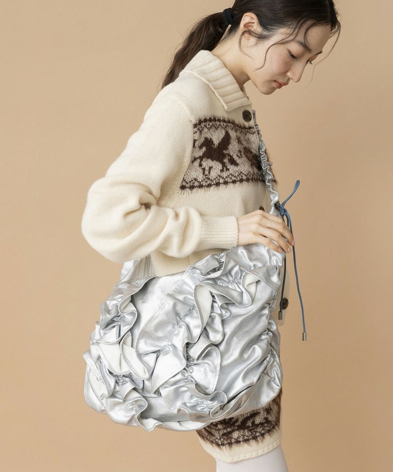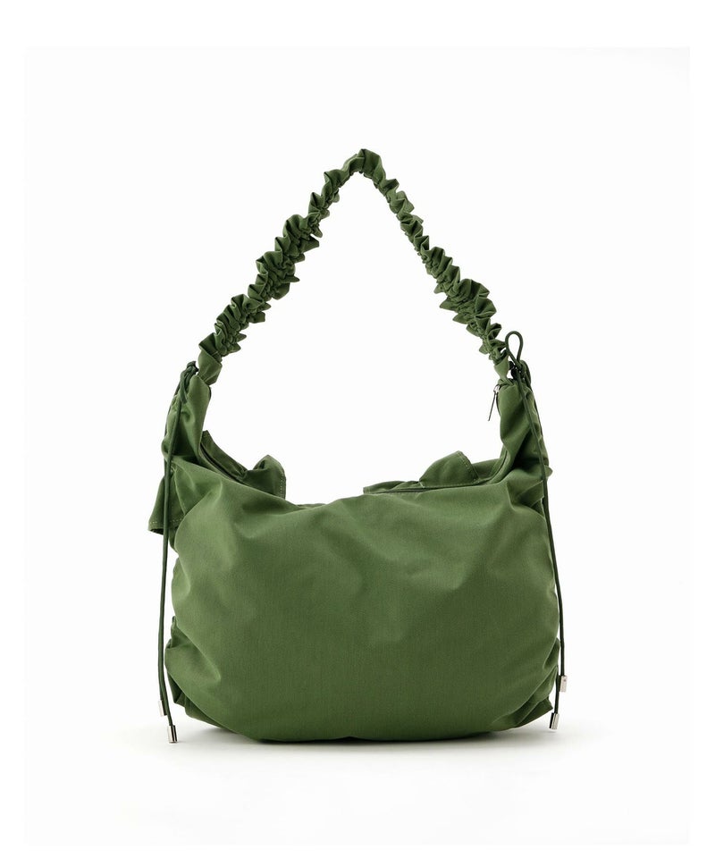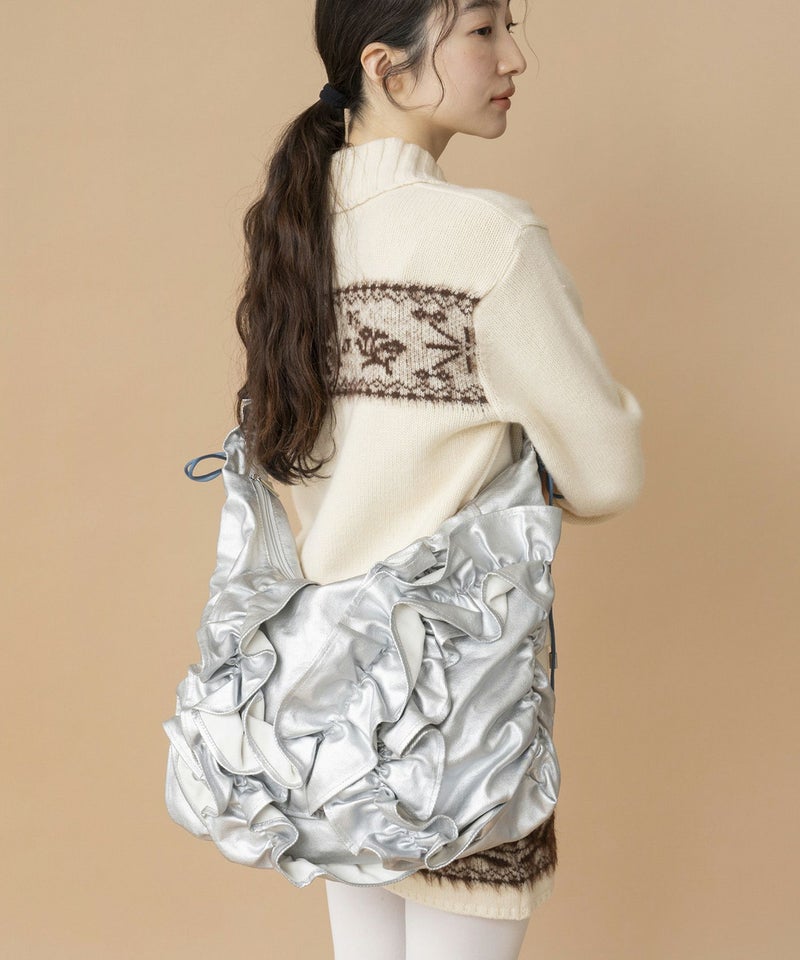 ボリュームたっぷりなフリルを前面にあしらったバッグはコーディネートの主役に。 フリルたっぷりですが、素材はカジュアルなコットン素材を使用しているため、甘すぎずデイリー使いしやすいアイテムに仕上がりました。 大容量で頑丈&内装にはファスナー付きポケットもあり、実用性も抜群です。 ショルダーストラップはサイドのコードで長さを調節可能です。