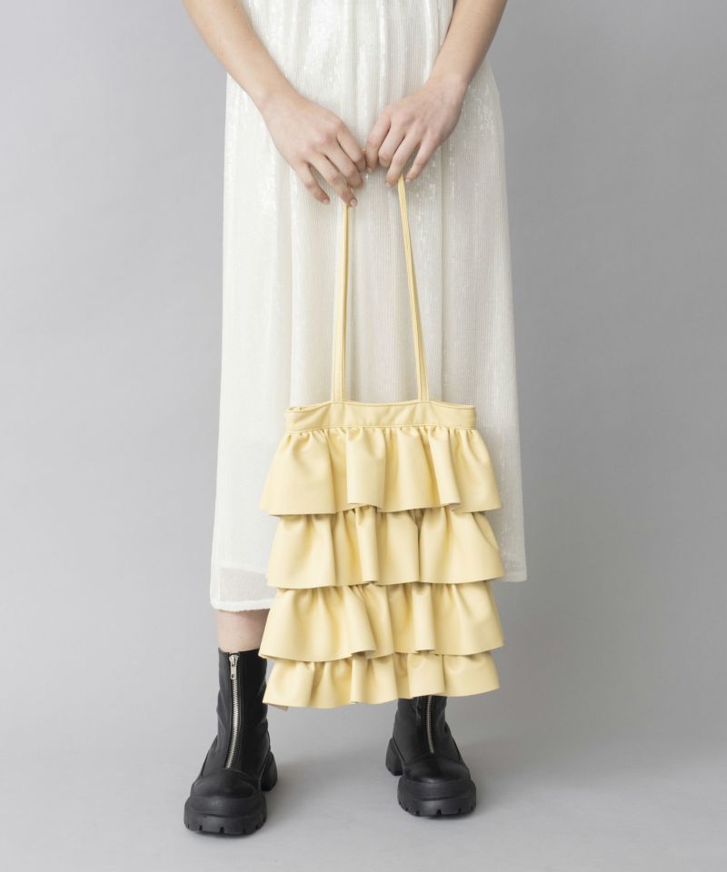 ラメ素材から、光沢を抑えた合成皮革に素材変更し、大人も持てるフリルバッグに。