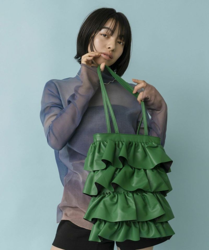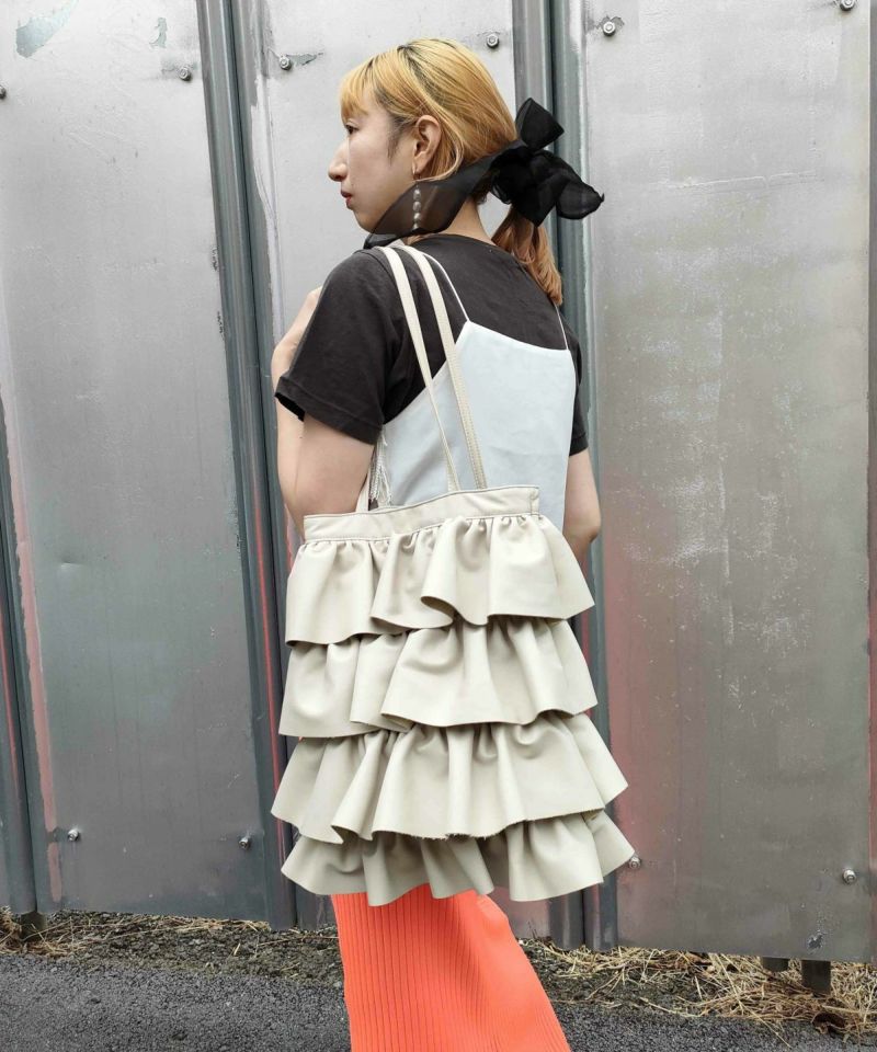 ラメ素材から、光沢を抑えた合成皮革に素材変更し、大人も持てるフリルバッグに。