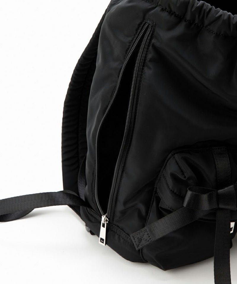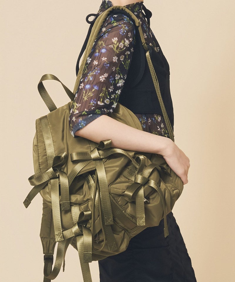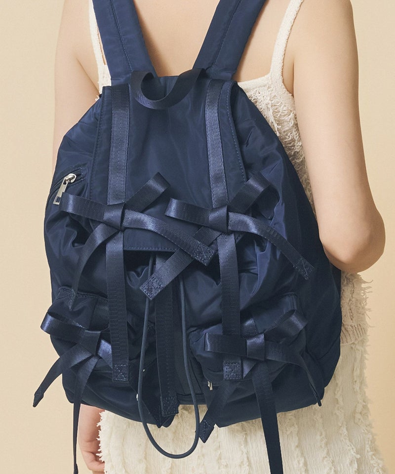 トレンドである複数のリボンがポイントのバッグパック。 モチっとした柔らかなフォルムでふんわり優しい雰囲気。 外側には2つのポケット、サイドのファスナーでスムーズに出し入れしやすいデザイン。 PCを入れられる内装ポケットも便利。ショルダーはお好みの長さに調整可能。 コーディネートに合わせやすいカラーで通勤通学、レジャーシーンにもおすすめ。