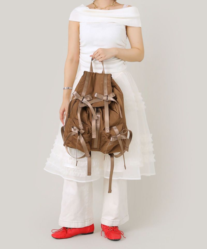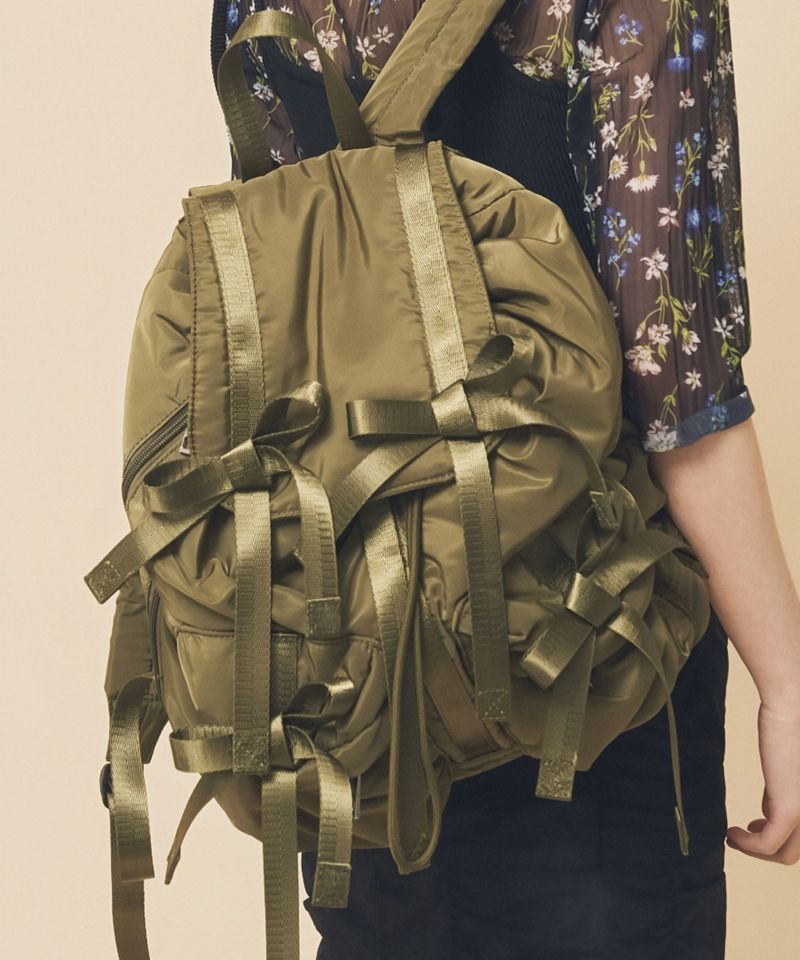 トレンドである複数のリボンがポイントのバッグパック。